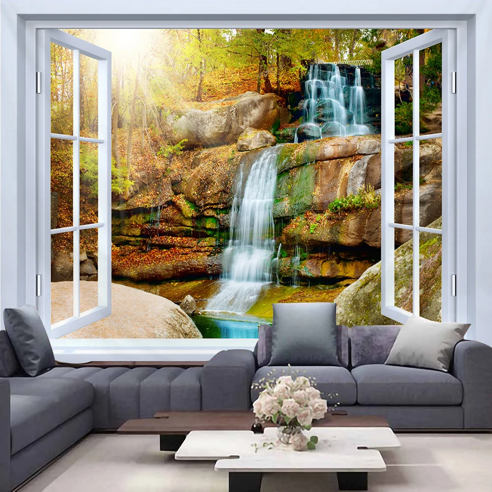 Imitation Window Great Wave Ocean Tapestry Landscape Wall Hanging Forest Blue Sea Sunrise Tapestries Backdrop Ceiling Room Decor