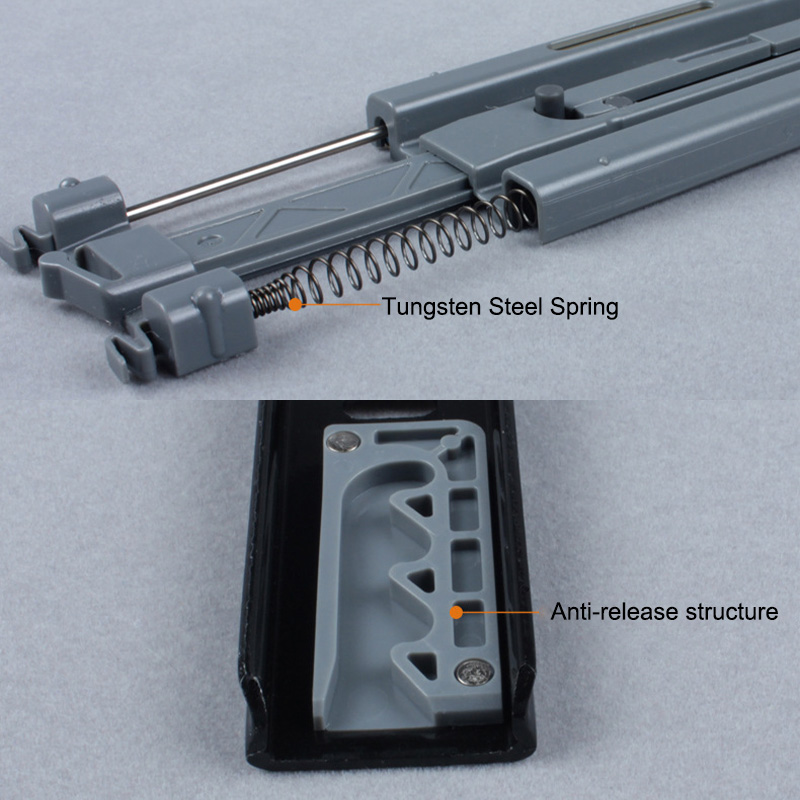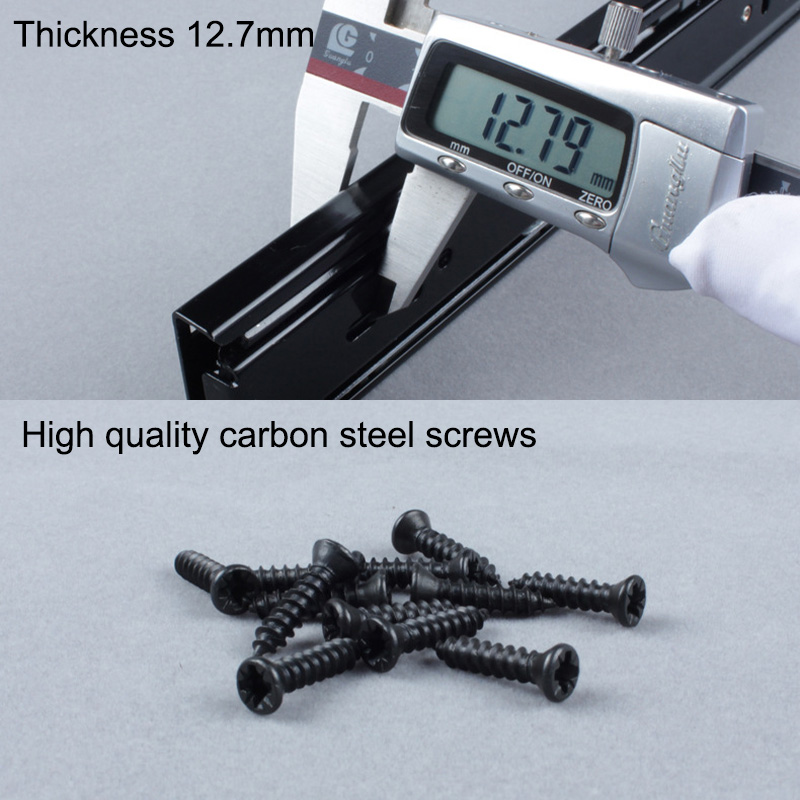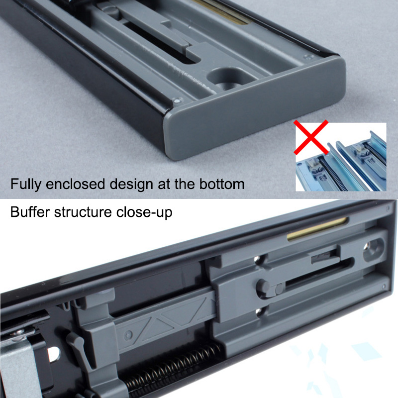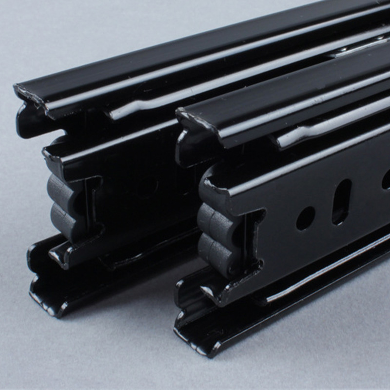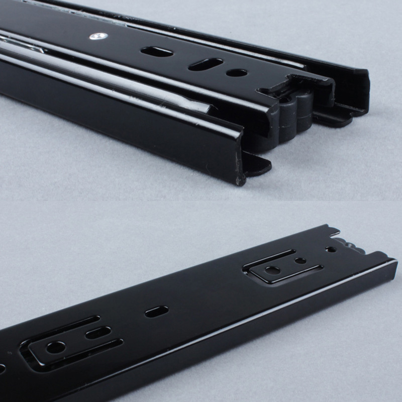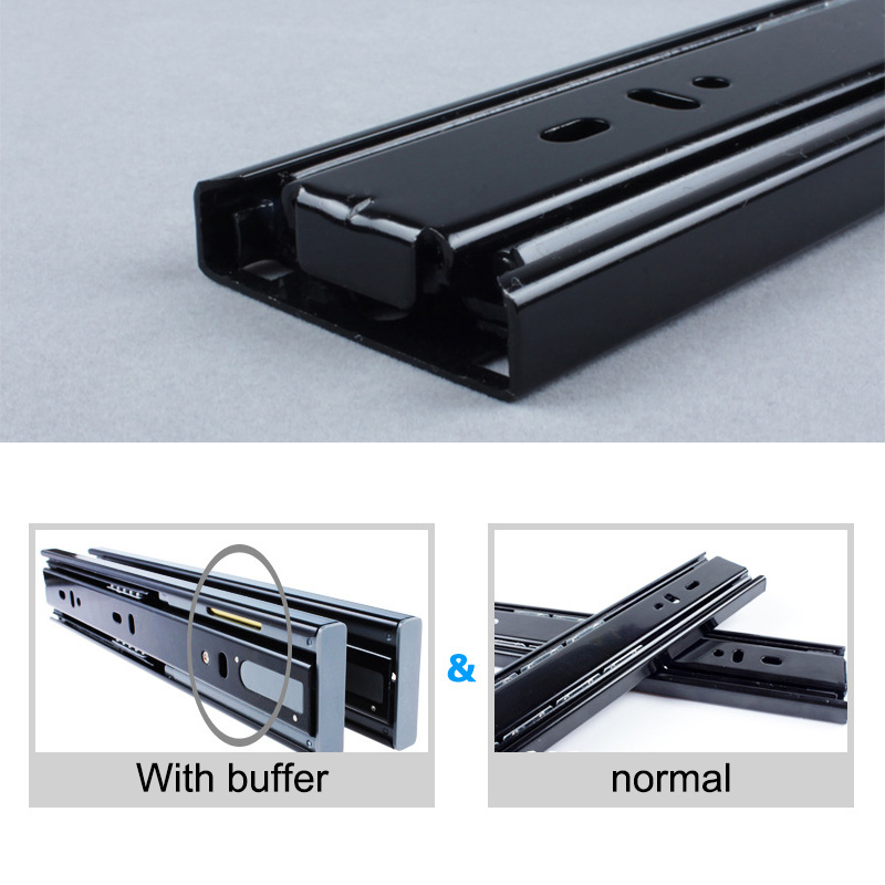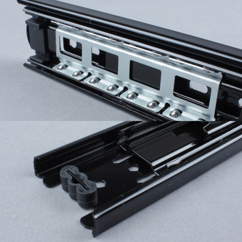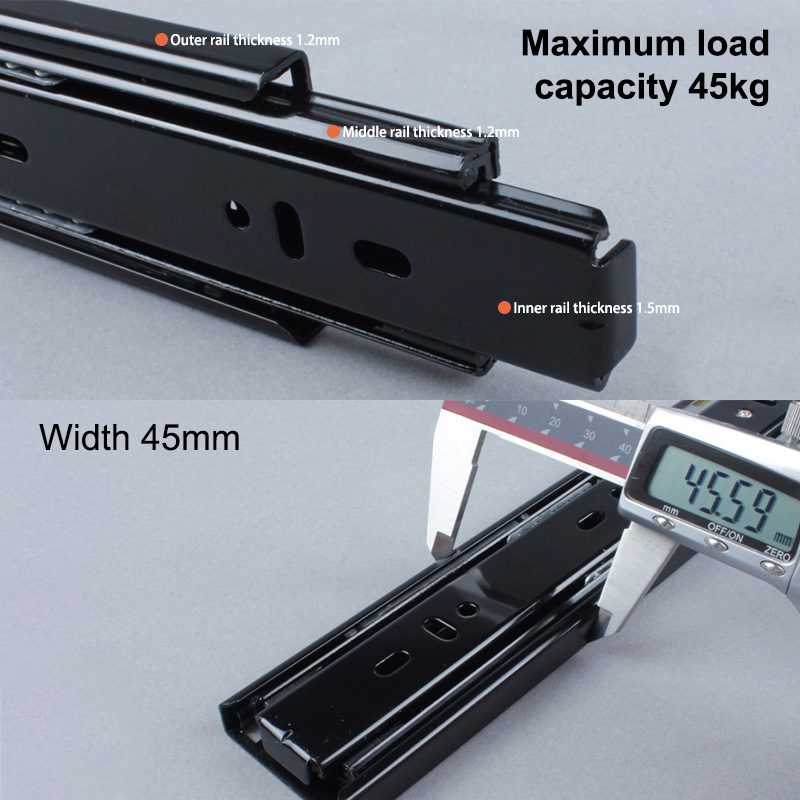 Название продукта: трехсекционная направляющая для выдвижных ящиков Материал: холоднокатаная сталь, медь и АБС-пластик Цвет: черный Ширина: 45 мм Длина: 250-600 мм/10-22 дюйма Материал Толщина: 1,2 мм * 1,2 мм * 1,5 мм * Нагрузка: 45 кг (100 фунтов) Боковое крепление интервал: 13,5-14 мм Количество: Цена указана за 1 пару (2 шт), 1 пара за 1 ящик