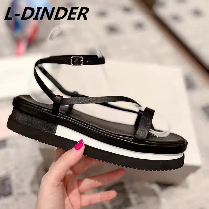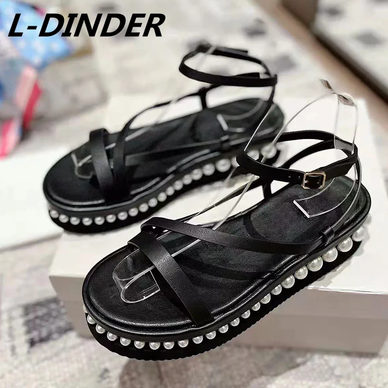 Summer New Pearl Rome Sandal for Girls Real Leather Flat Platform Flipflop Beach Shoe Comfort Buckle Strap Holiday Women Sandals