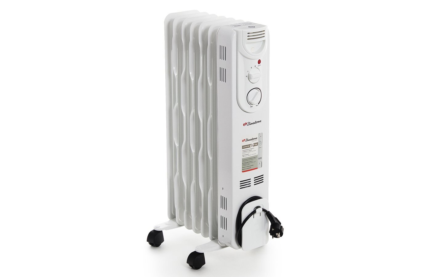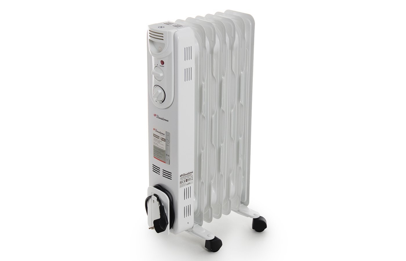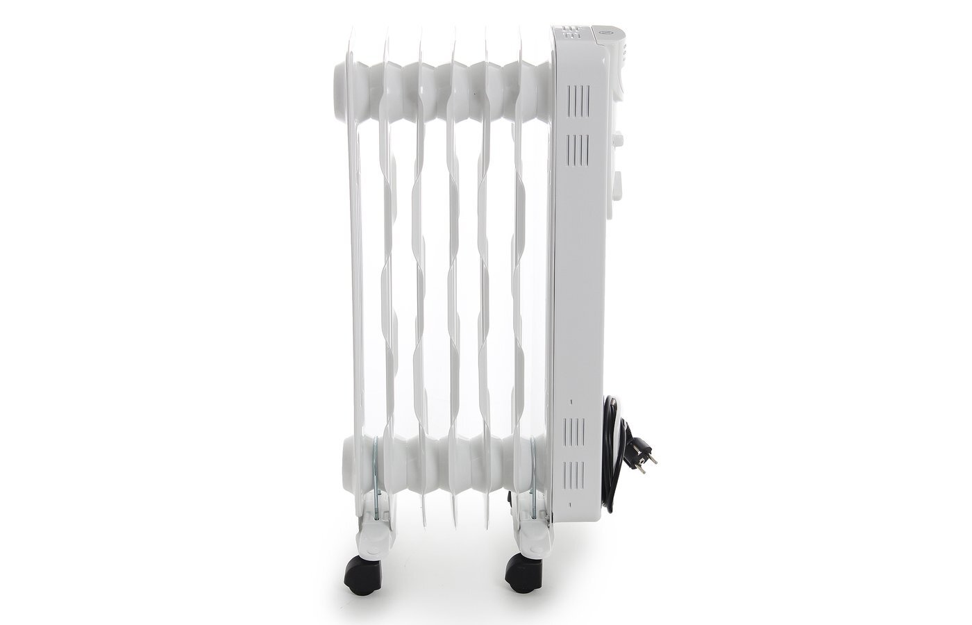 Белый масляный радиатор BINATONE OR-070, работающий от электричества, состоит из семи секций, на основной панели имеется небольшой отсек для хранения шнура питания, два регулятора – один для выбора мощности, второй для выбора температуры.