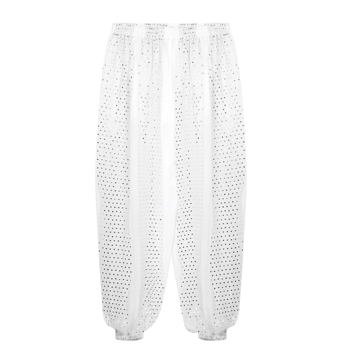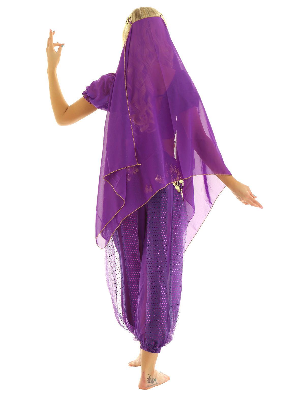 Топ с короткими рукавами с прошитыми бусинами в виде колокольчиков и монет; Дизайн с завязками на спине для лучшей посадки; Штаны-шаровары с эластичным поясом с блестящими блестками и тюлевым накладным слоем; Эластичный вырез для ног.