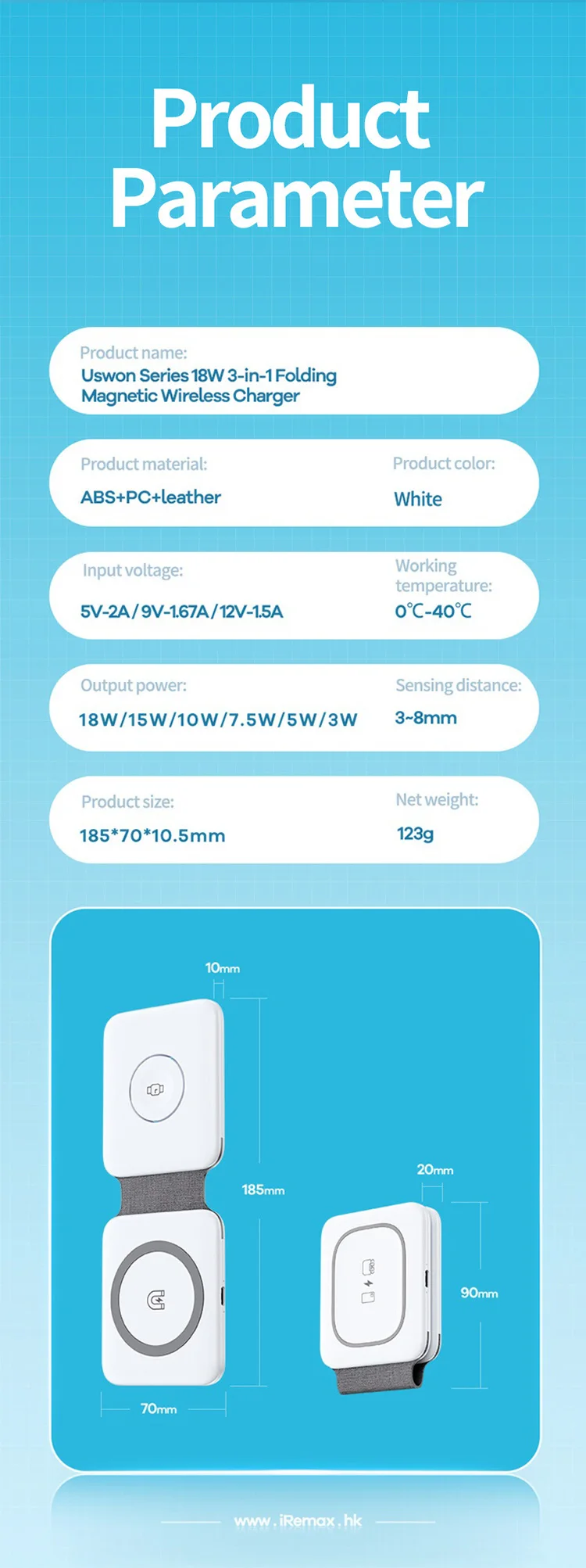 Название продукта: Uswon серии 18W 3-in-1Folding Магнитное Беспроводное зарядное устройство Материал изделия: ABS + PC + кожа Цвет изделия: белый Входное напряжение: 5V-2A/ 9V-1.67A/ 12V-1.5A Рабочий Температура: 0 °C-40 °C Выход Мощность: 18 Вт/15 Вт/10 Вт/7,5 W/5W/3W Расстояние срабатывания: 3 ~ 8 мм Размер изделия: 185*70*10,5 мм Вес нетто: 123 г