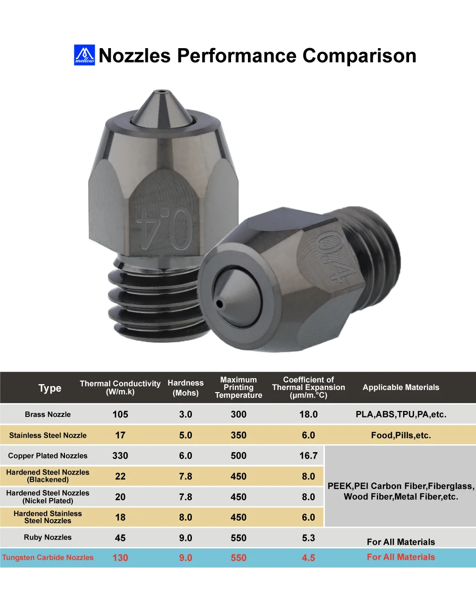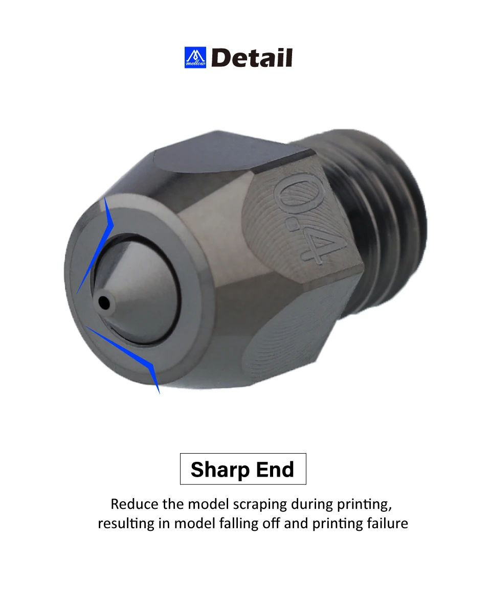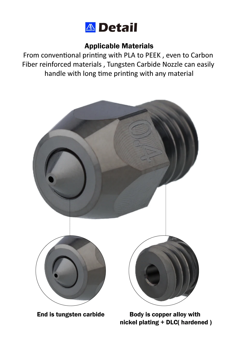 Низкая сила нажатия | Карбид вольфрама сопло с высокой чистотой более 99.98% и высокая тепловая производительность сохраняет ровную температуру наконечника сопла во время печати, тем самым гарантируя стабильную экструзию.