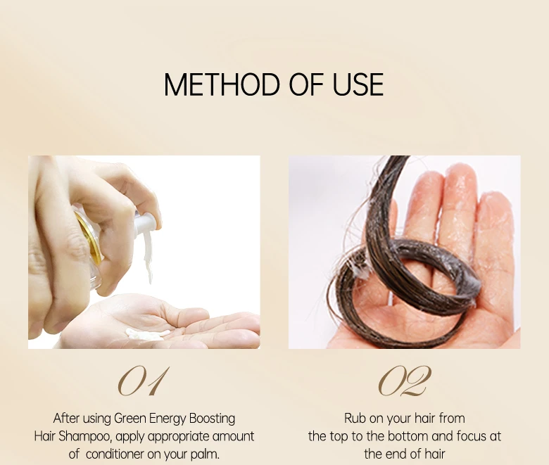 1. После использования зеленого энергетического шампуня для волос нанесите соответствующее количество кондиционера на ладонь.