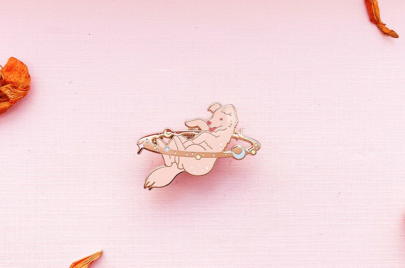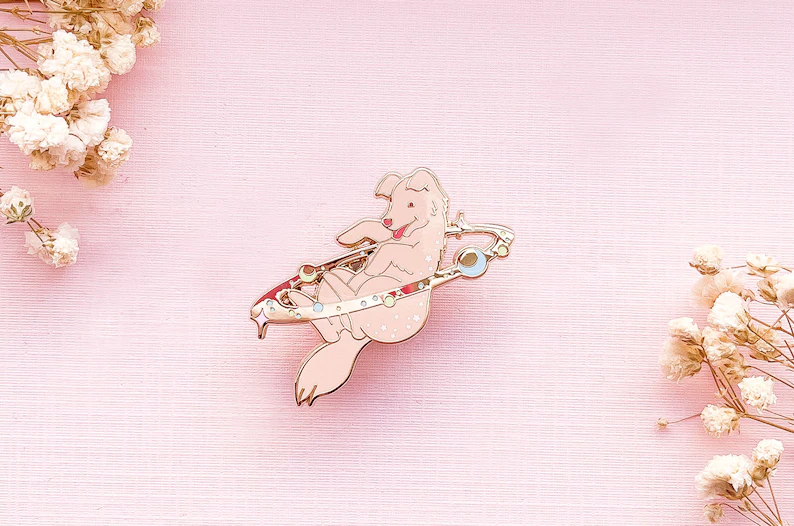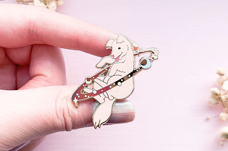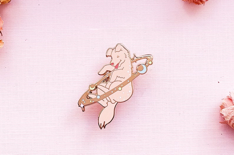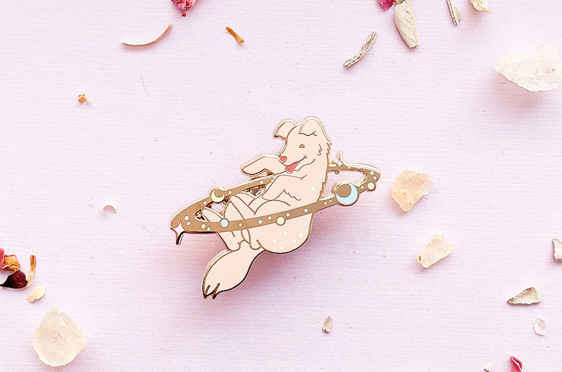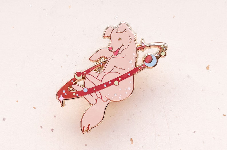 Эта очаровательная космическая собачья булавка имеет счастливую собаку со звездным космическим кольцом.