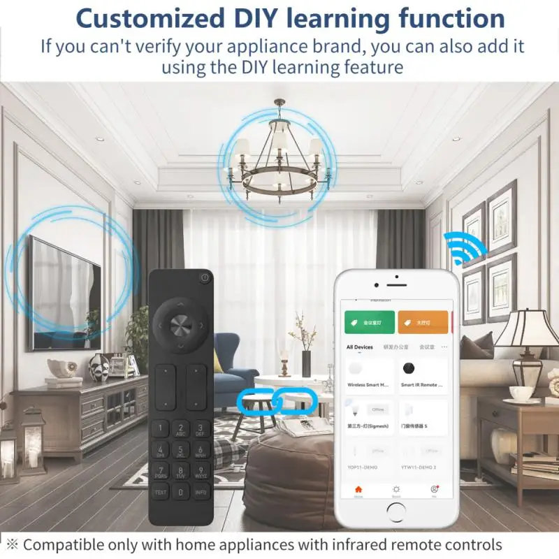 Поддерживает 50000 ИК (38 кГц ИК только в том случае, нет радиочастотных) управляемых устройств, включая свой кондиционер, ТВ, ТВ коробка, DVD, аудио, видео Регистраторы, приемник, и т. д.