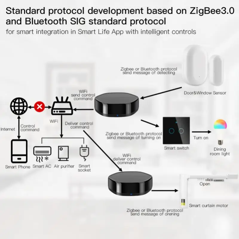 Беспроводной интеллектуальный многофункциональный Шлюз может позволить интеллектуальным продуктам с различными протоколами (BLE Mesh, ZigBee) для обмена информацией. Его можно использовать в качестве моста для подключения продуктов Smart Life Ble Mesh и продуктов ZigBee. Он имеет встроенный модуль инфракрасного передатчика и может также управлять другими бытовыми приборами. Инфракрасное электрическое оборудование.