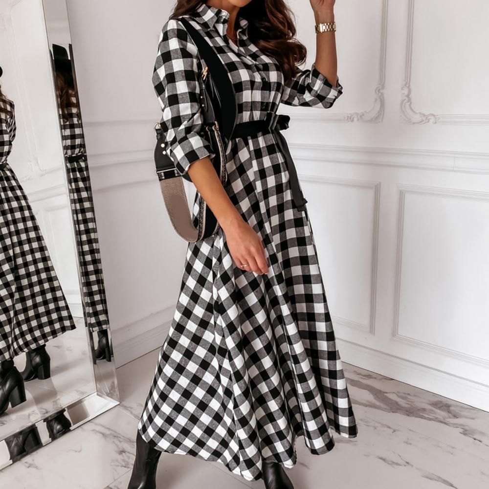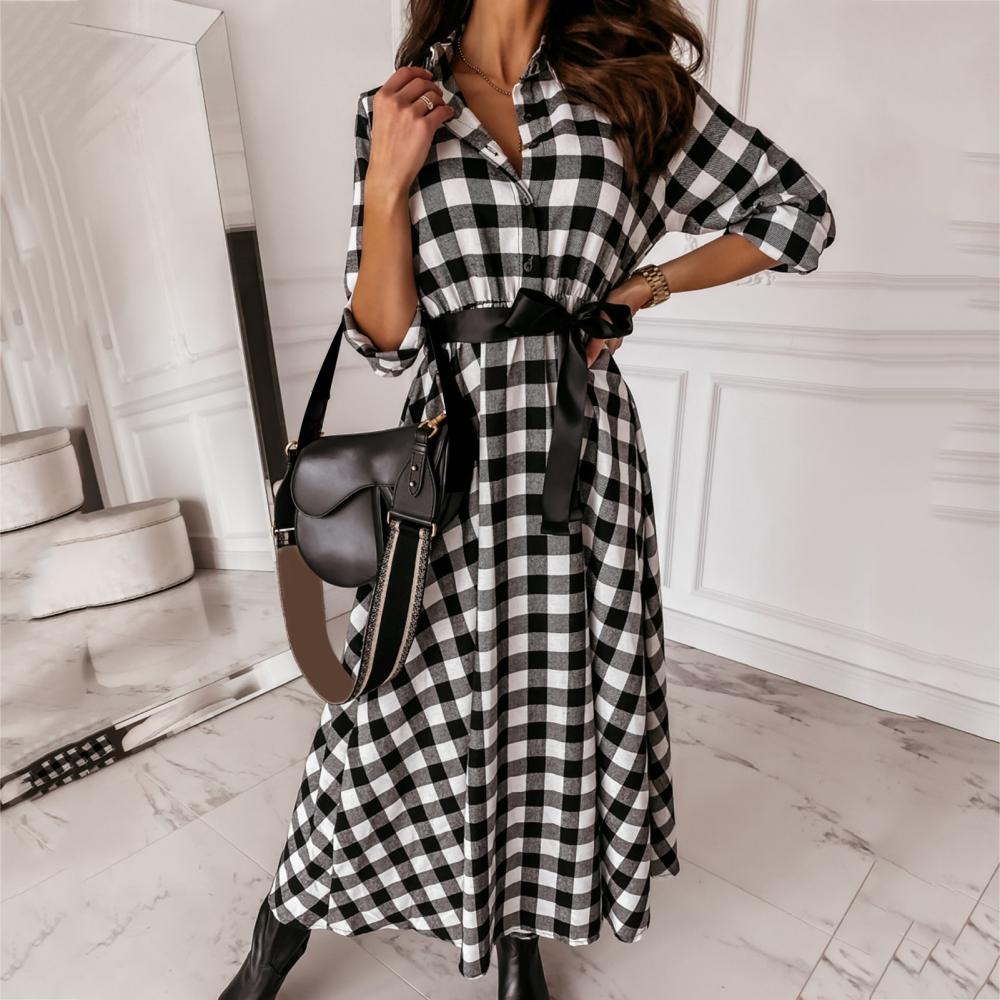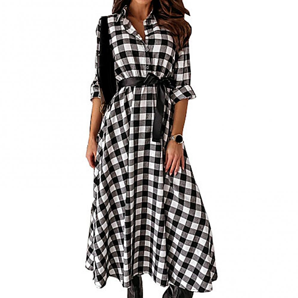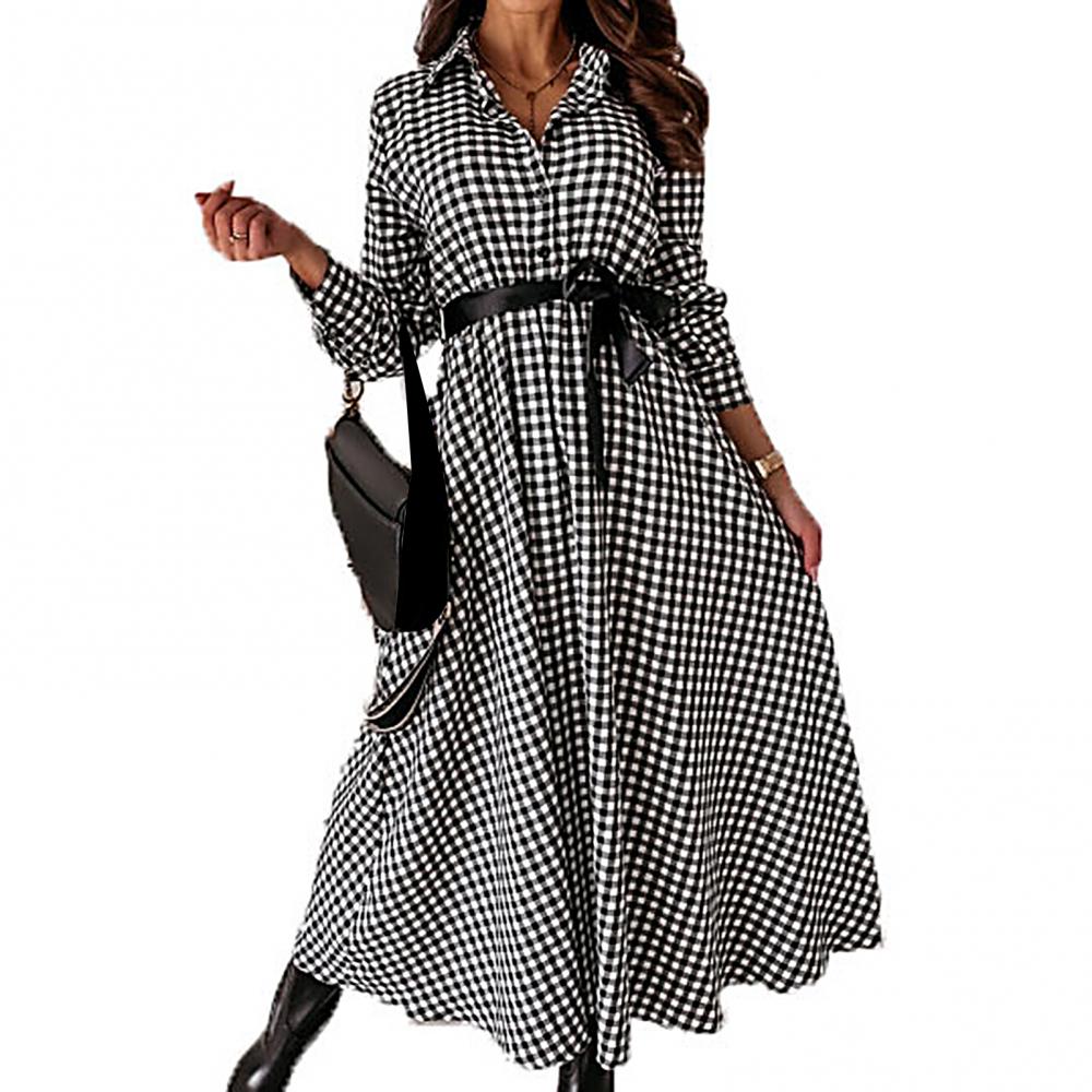 Женское шикарное платье макси с отложным воротником и длинным рукавом в клетку с большим подолом на пуговицах и поясом