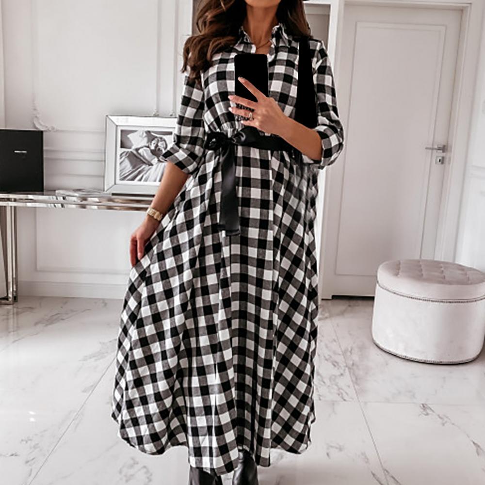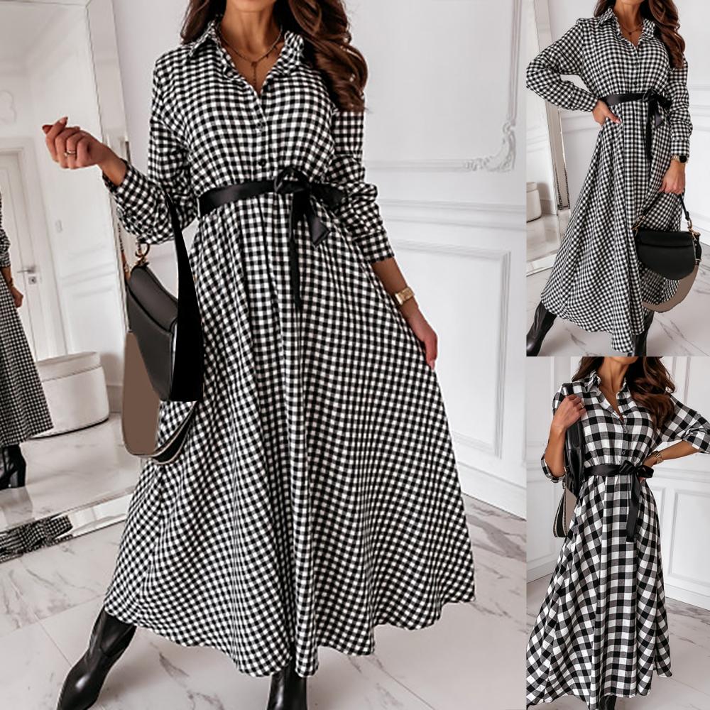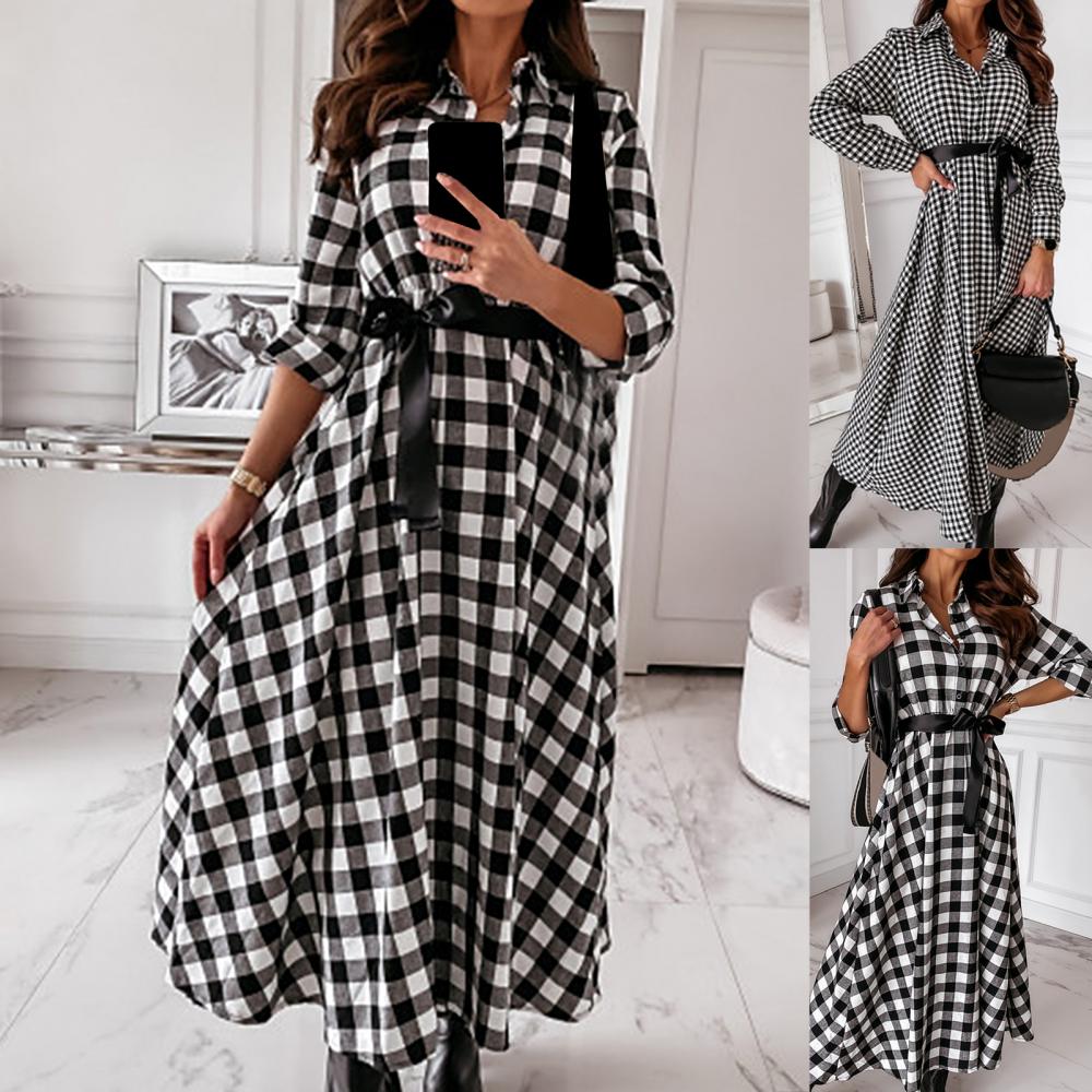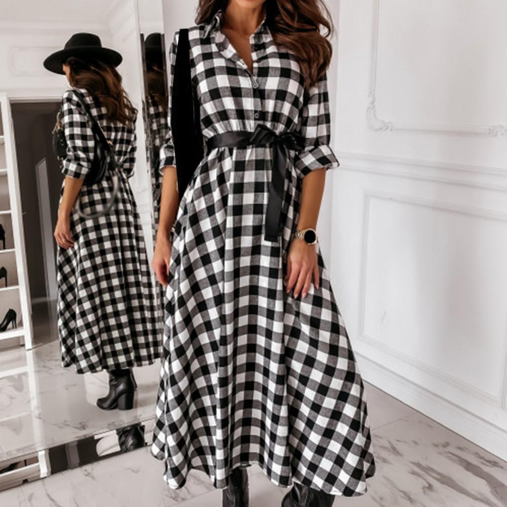 Женское шикарное платье макси с отложным воротником и длинным рукавом в клетку с большим подолом на пуговицах и поясом