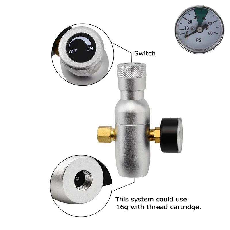 2.0-60 PSIРегулирующий диапазон, поможет точно карбонизировать ваше пиво.Резьба 3/8Подходит для резьбы16 гКартридж CO2.(Не включает CO2 Картридж)
