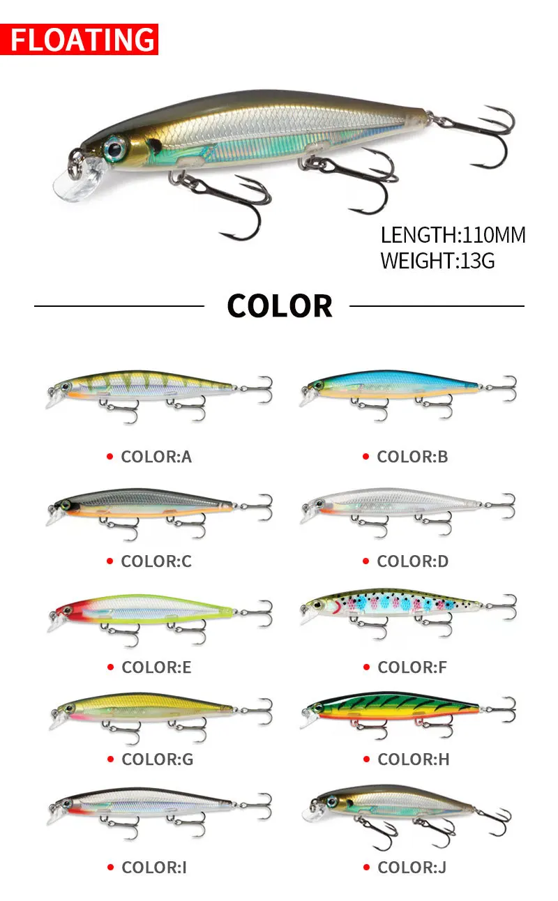 Яркие цвета и узоры настоящей приманки создают жизнь, как плавающие движения в воде! Гладкие, быстрые, красочные 3D глаза и острые тройные Крючки делают его мощным инструментом захвата