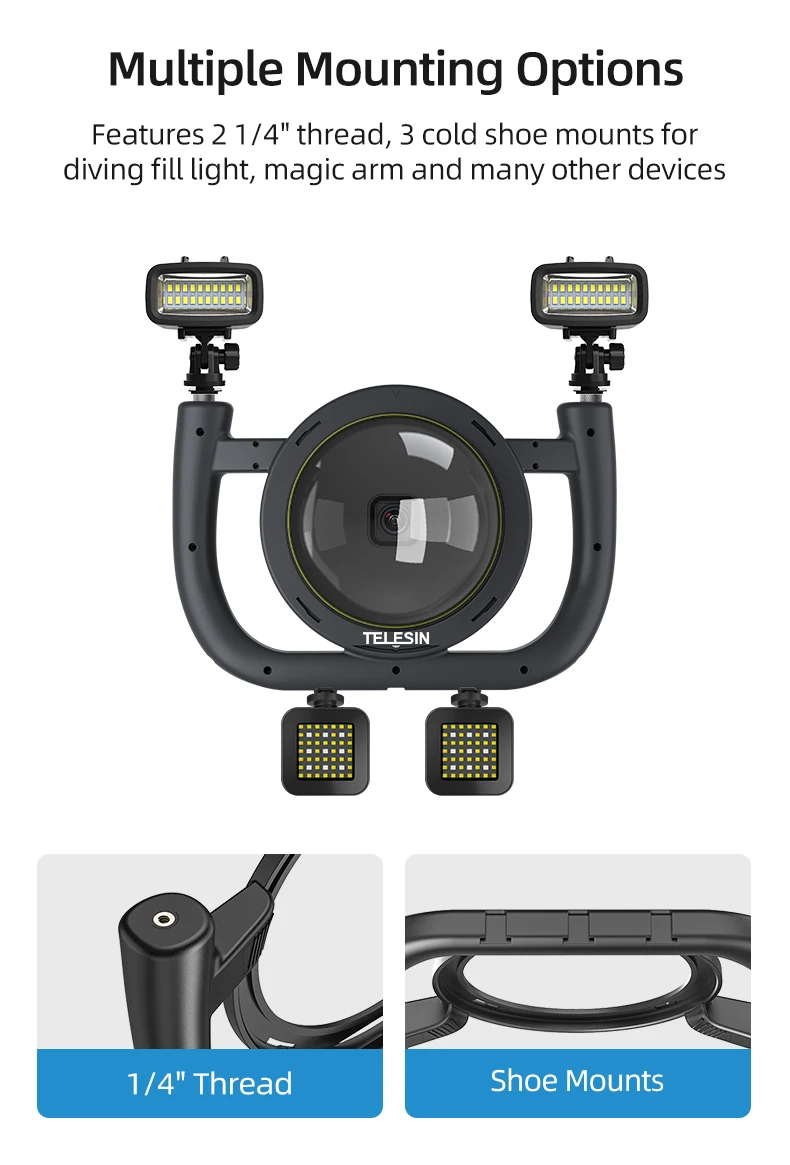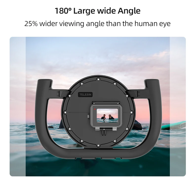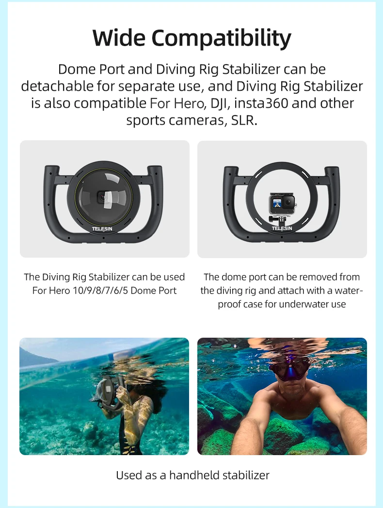4.Multifunctional!Dome port and diving rig stabilizer can be detachabel for separate use.Diving rig stabilizer is compatible for GoPro,DJI,Insta360 and other action camera.And also suitable all TELESIN dome port,Like for gopro hero 5 6 7 8 9 10 dome port.