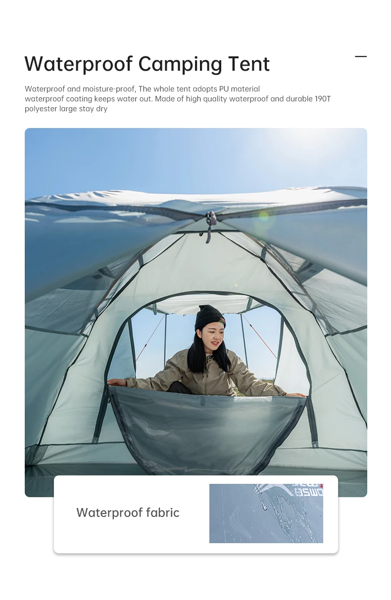 2: палатка изготовлена из полиэстера 190T, Всесезонная палатка с водонепроницаемостью 2000 мм и Всесезонная палатка с водонепроницаемостью 5000 мм, эффективно защищает от сильного дождя, позволяет путешествовать без беспокойства