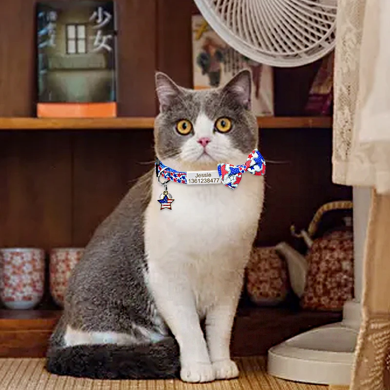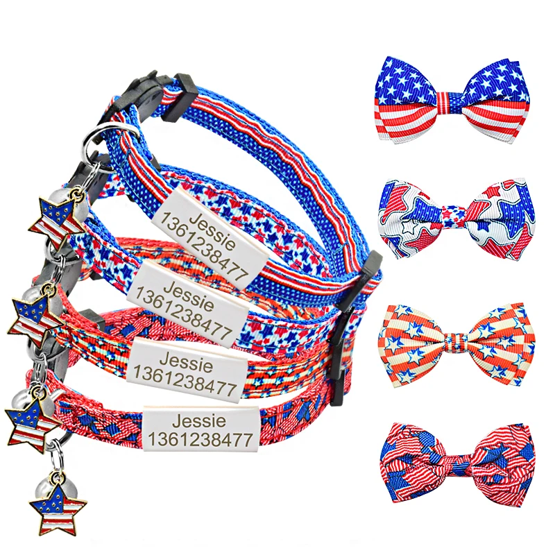 Ошейник с бантиком и котом, индивидуальная именная табличка, воротник с бантиком, колье с колокольчиками, на заказ, выгравированный ярлык, ошейник с котом
