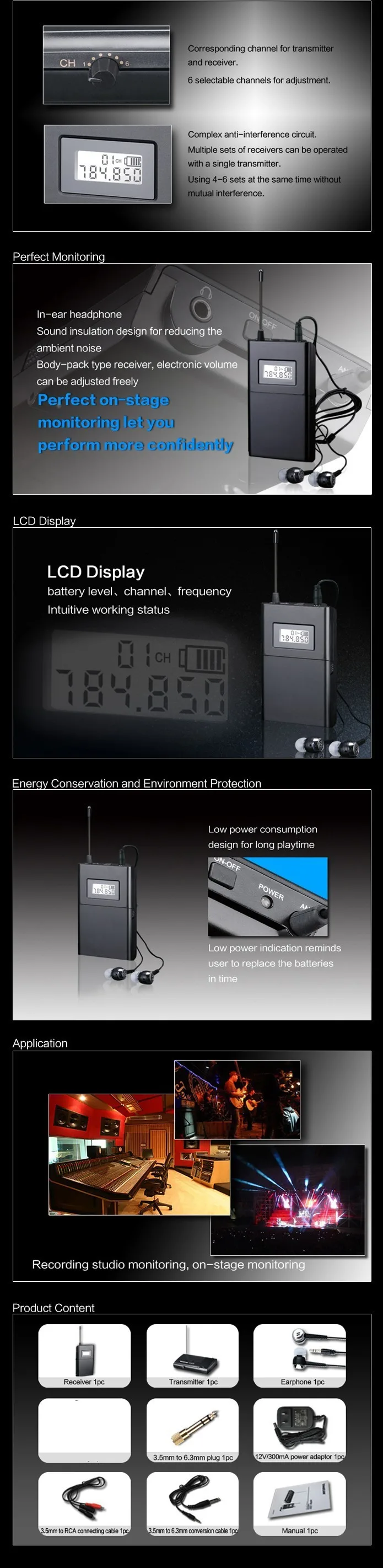 Содержание продукта:WPM-200 передатчик 1 шт.WPM-200 приемник с наушниками 5 шт.3,5 мм до 6,3 мм разъем 1 шт.3,5 мм до 6,3 мм единицы измерения кабель 1 шт.3,5 мм RCA соединительный кабель 1 шт.Руководство 1 шт.110V-240V адаптер питания 1 шт.Посылка: крафт-бокс