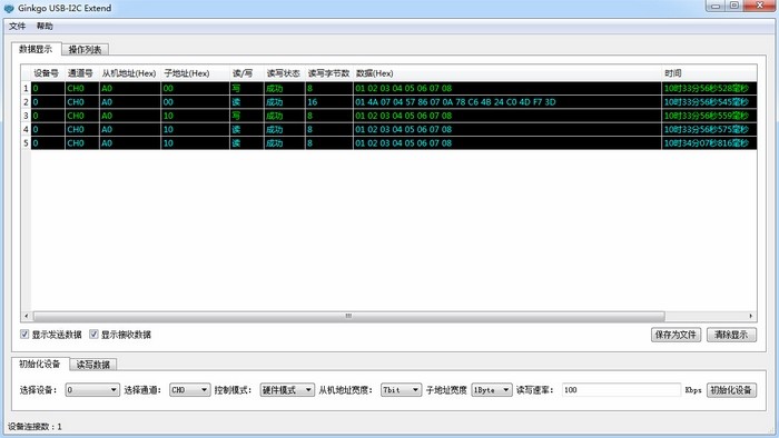 USB-I2C расширения: передача данных или чтение могут быть предварительно отредактированы в списке, и программное обеспечение может считывать и записывать данные в соответствии с режимом работы редактирования списка. Рекомендуется использовать это программное обеспечение, когда требуется комплексное управление чипом интерфейса I2C;