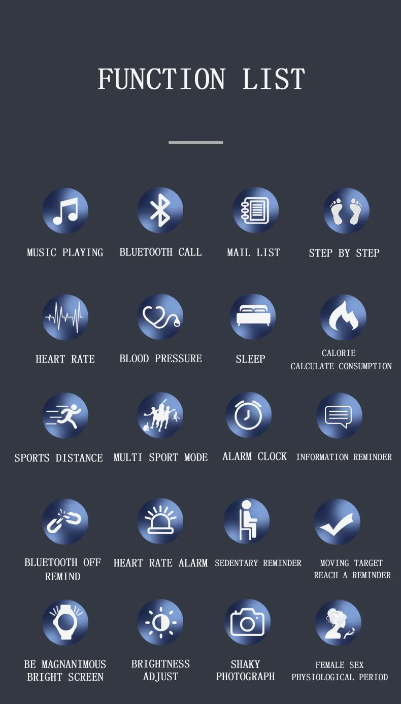 Функции: музыка, циферблат/входящий вызов, История звонков, контакты, секундомер, обратный отсчет, Поиск телефона, мультиспортивный режим, сон, пульс, кровяное давление, напоминание о тревоге, напоминание о сообщениях SMS/App, напоминание о отключении Bluetooth, напоминание о пульсе, напоминание о сидячем положении, напоминание о достижении цели в спорте, устройство привязки, обнаружение ношения, Поворот запястья для яркого экрана, регулировка яркости, продолжительность блокировки экрана, Настройка стиля основного интерфейса, режим низкой мощности, режим «не беспокоить», фотосъемка, Сброс пароля, трансляция устройства
