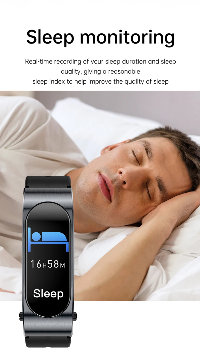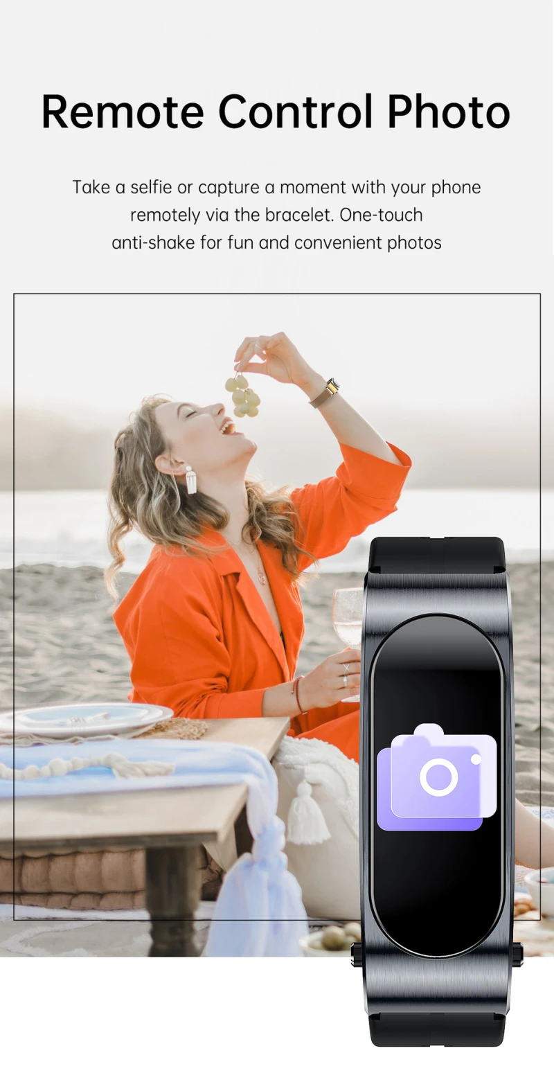 4. [Основные Функции]:Фитнес-трекер, ВКЛ./ВЫКЛ., настройки интерфейса в режиме ожидания, счетчик шагов, обнаружение калорий, сон, напоминание/push, удаленная камера, поиск мобильных телефонов, музыкальный будильник, напоминание о сидячем положении, браслет напоминания о звонках, погоде, Bluetooth Двойные звонки гарнитуры.