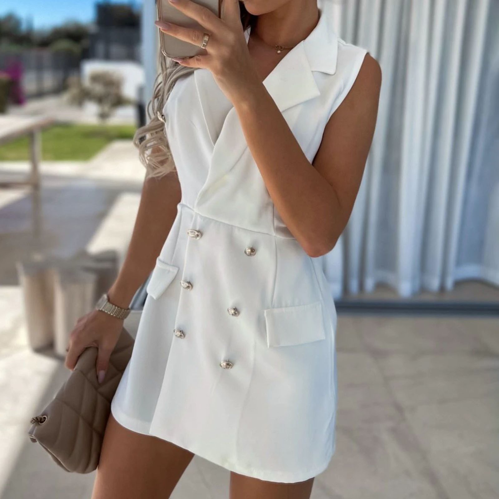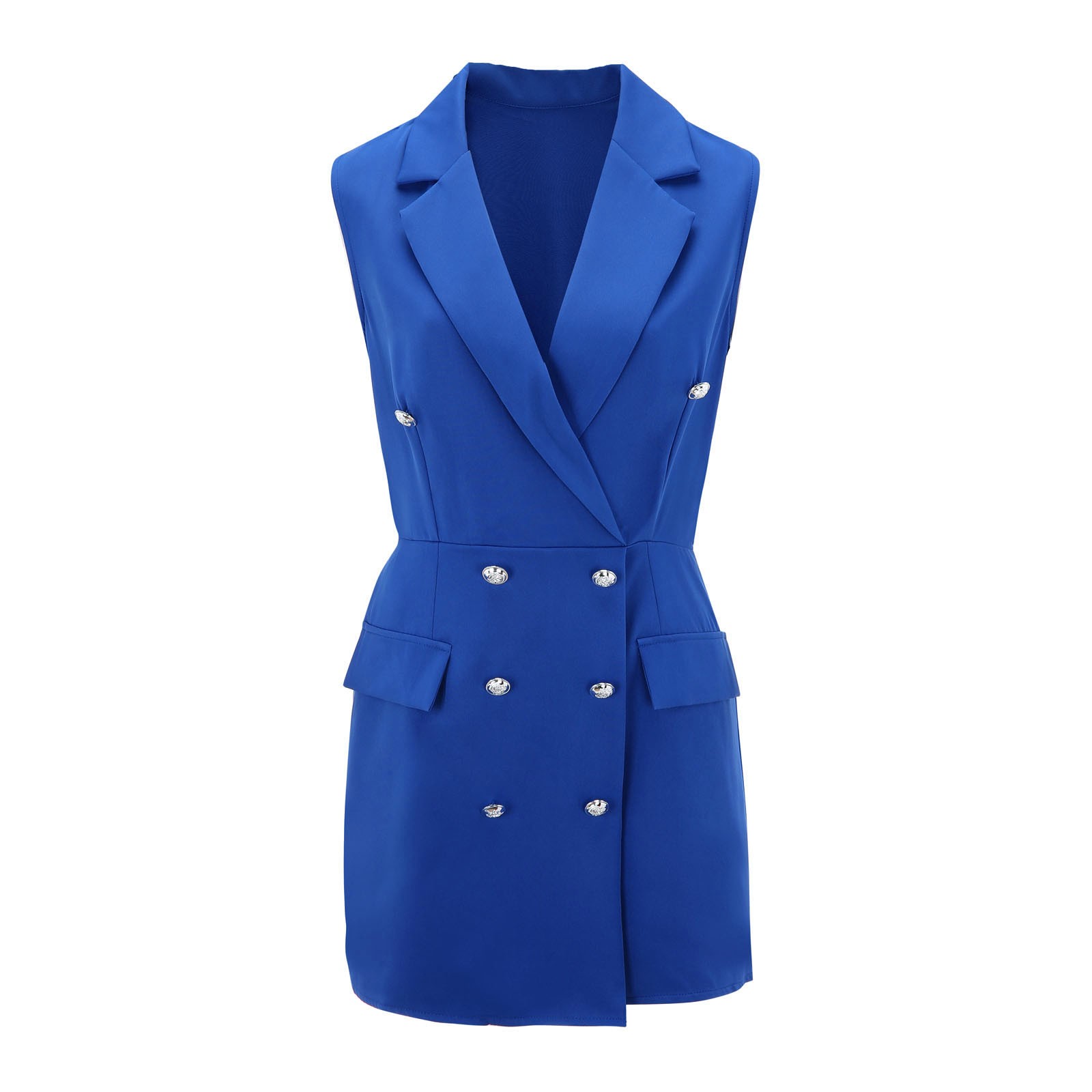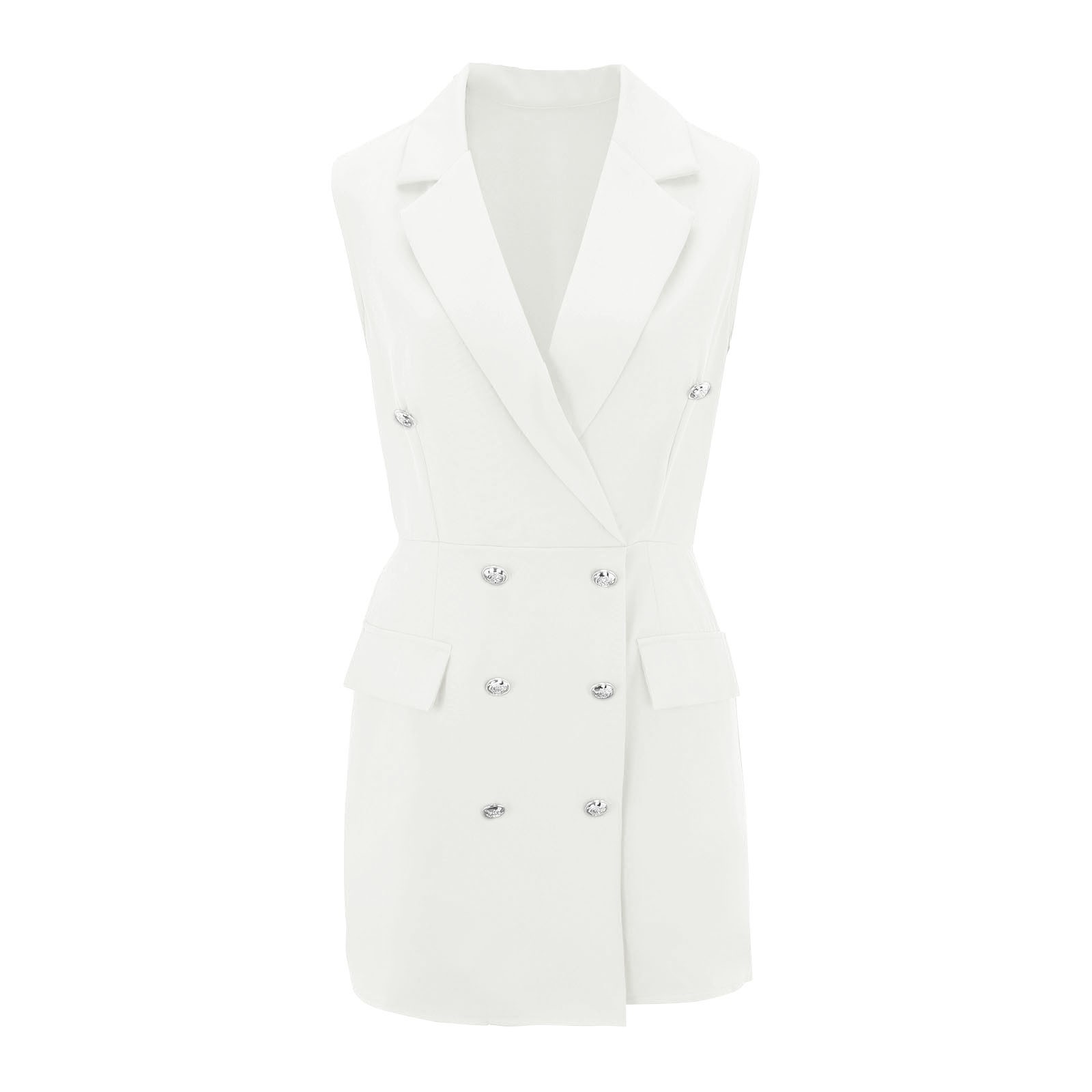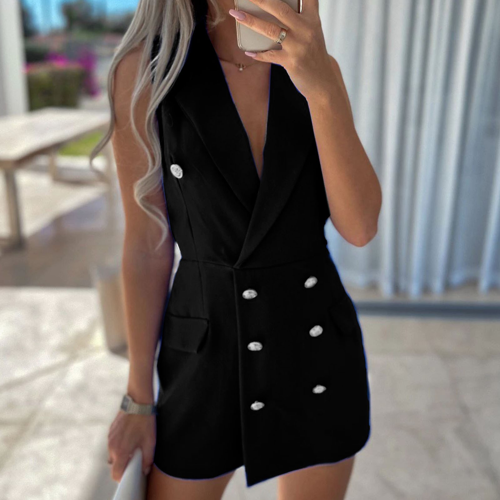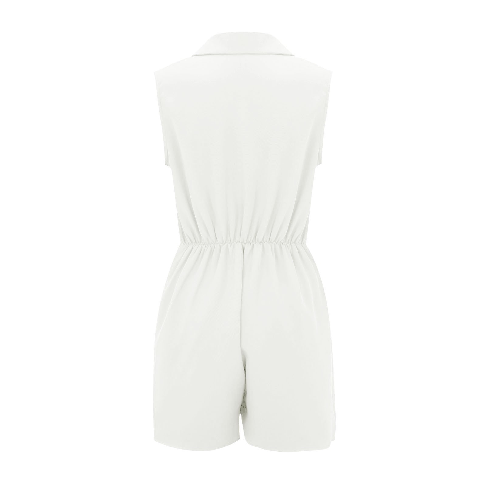 Особенности: без рукавов, комбинезон, двубортный, эластичный пояс на завязках с двумя декоративными карманами.