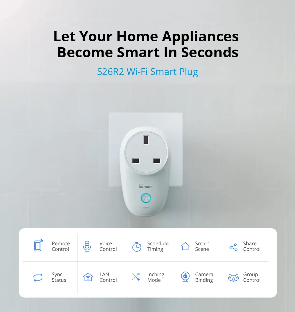 【Дистанционное управление от Anywhere】 S26R2 WiFi вилка может включить или выключить подключенные устройства из любого места с помощью приложения eWeLink