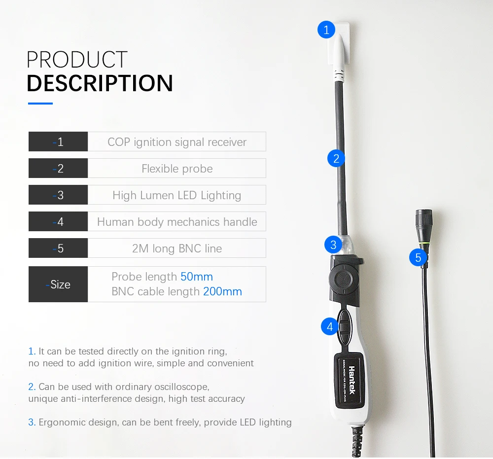 HT20COP катушка на разъем и зонд сигнала может легко поймать форму Зажигания Автомобильного Двигателя. Сигнал зажигания-это окно, через которое мы можем увидеть, что произошло в камерах сгорания двигателя. Он определяет, нужно ли заменить или очистить вилку зажигания. Хорошо ли работает топливный инжектор в электронной системе впрыска топлива? Есть ли какие-либо проблемы с герметичностью воздушного цилиндра? Увеличивается ли зазор между вилками зажигания? Острая форма электрода зажигания? Слишком ли много загрязнения нефтью или осаждения углерода на вилках зажигания? Ухудшается ли изоляционное свойство вилки зажигания? Есть ли какие-либо проблемы в системе питания аккумуляторной батареи?Его можно использовать с обычным осциллографом. Специальная конструкция с защитой от помех, высокая точность измерений. Эргономичный дизайн, может быть произвольно изогнут. Яркий светодиодный индикатор, который удобен в эксплуатации ночью или в темном состоянии.