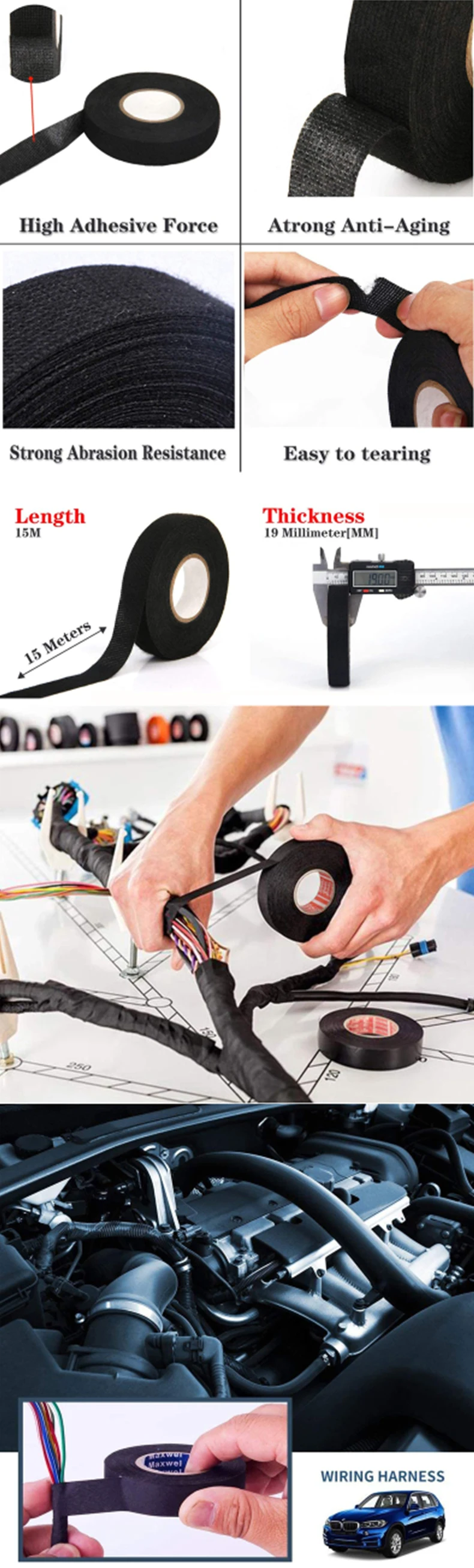 Соединительная Проводная лента, характеристики продукта Звукопоглощающая ПЭТ Нетканая лента, натуральный резиновый клейкий материал. ПЭТ Нетканая лента является гибкой и износостойкой, устойчивой к старению, ручному разрыву Цвет: Черный Длина 15 м, в основном используется в кабельных комплектах для транспортных средств внутренней обмотки жгутов