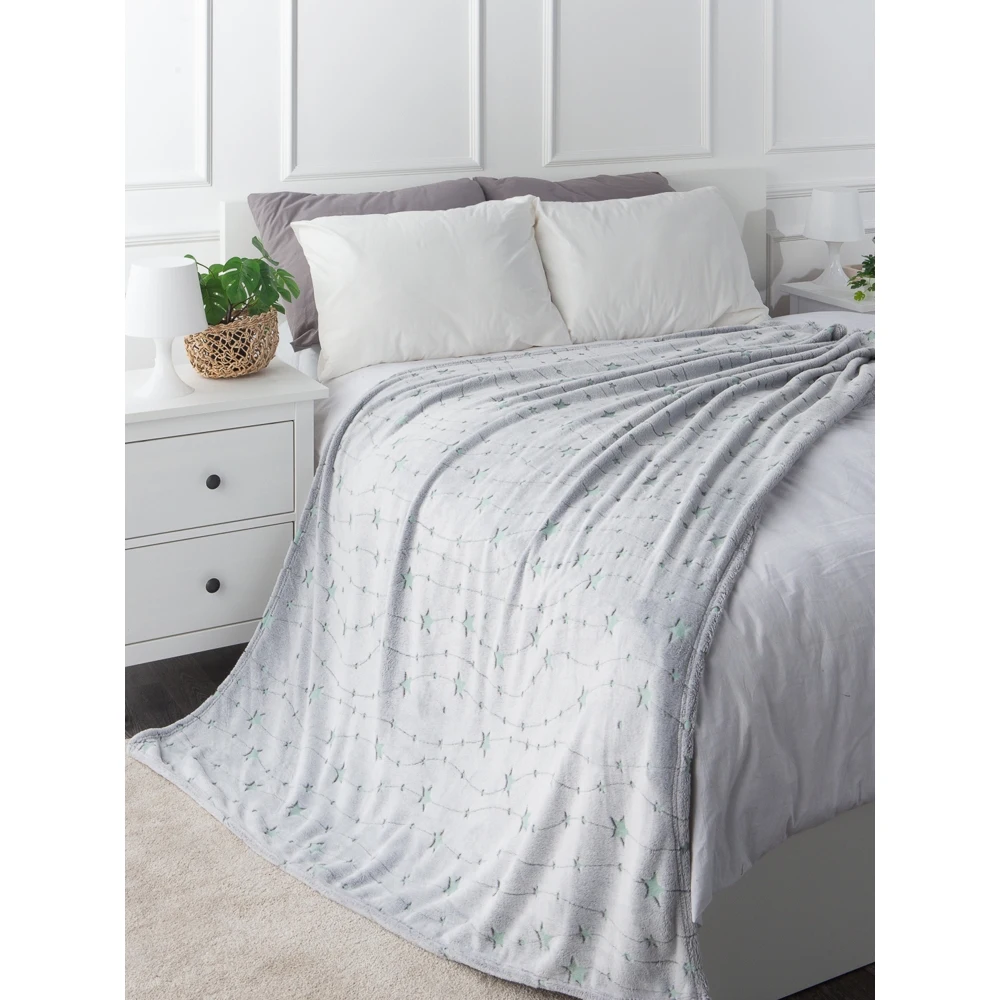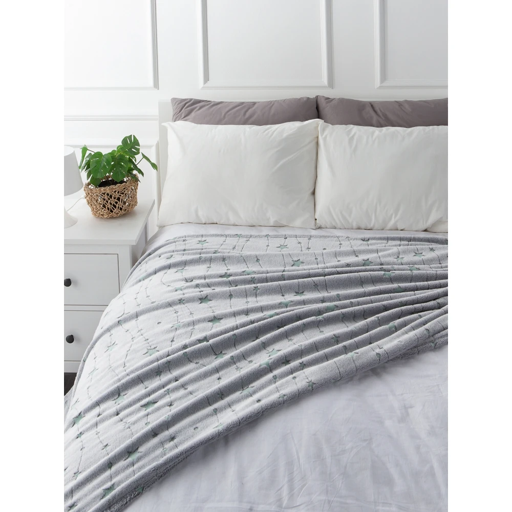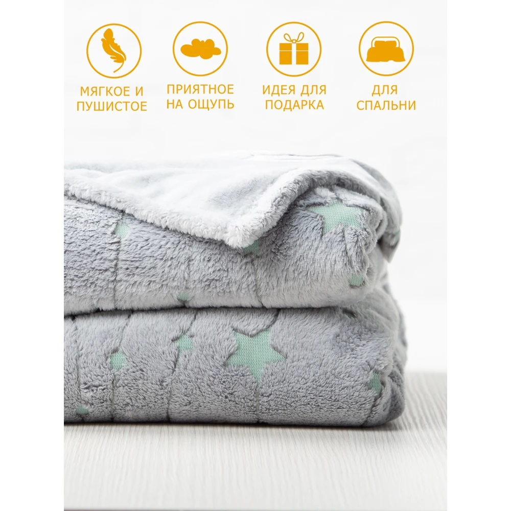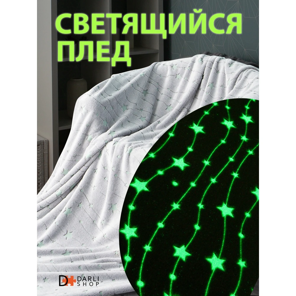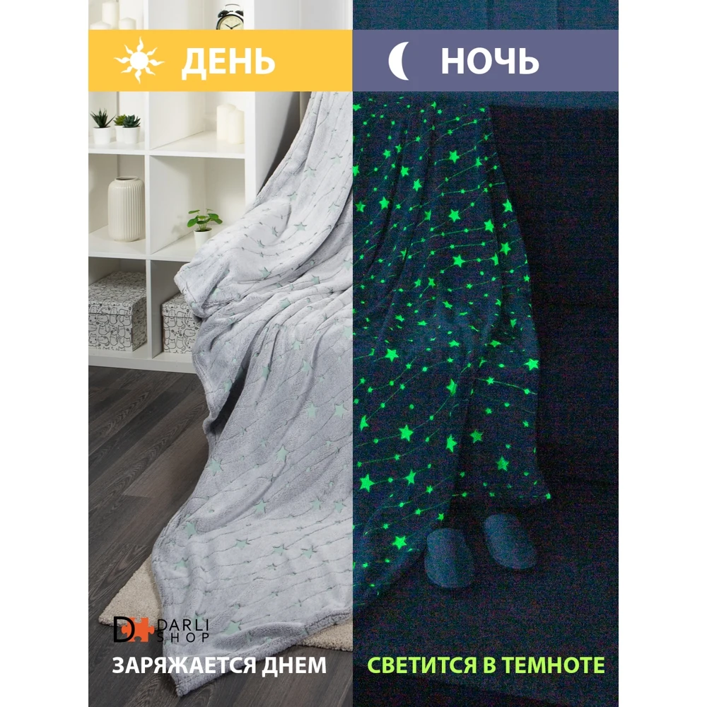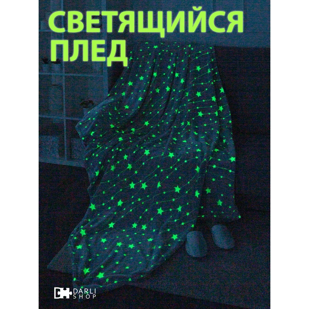 Светящийся плед - замечательный подарок для детей и взрослых! Ребенок будет в восторге от такого подарка! В этот уютный плед захочется укутаться всем! Приятная спокойная расцветка впишется в любой интерьер гостиной, спальни или детской. Такой плед пригодится и в машине, его можно взять с собой для отдыха на природе. Оптимальный размер 150х200 см. Плед светящийся в темноте удобно использовать как покрывало на детскую кровать, детское одеяло, детский плед или плед для новорожденных. Перед первым использованием рекомендована стирка с антистатиком. Яркость и длительность свечения узора зависит от интенсивности дневного освещения. Плед необходимо заряжать на свету перед использованием. Можно использовать для зарядки как дневной свет, так и искусственное освещение. Светящийся узор не содержит фосфора и других вредных веществ. Свечение происходит благодаря светонакопителю люминофор, он абсолютно безопасен для здоровья людей и животных. Уход: машинная стирка при 40 градусах без отбеливателя.
