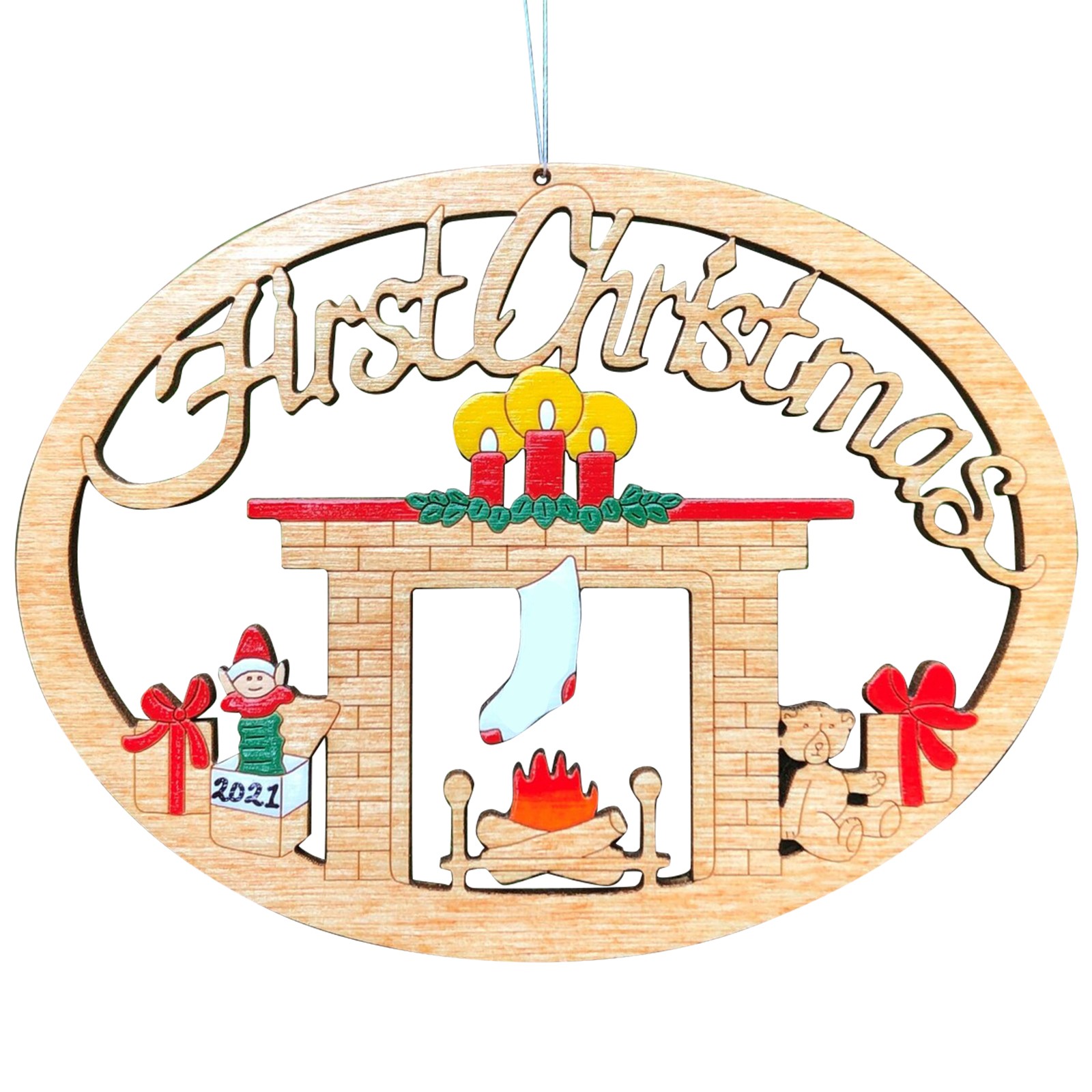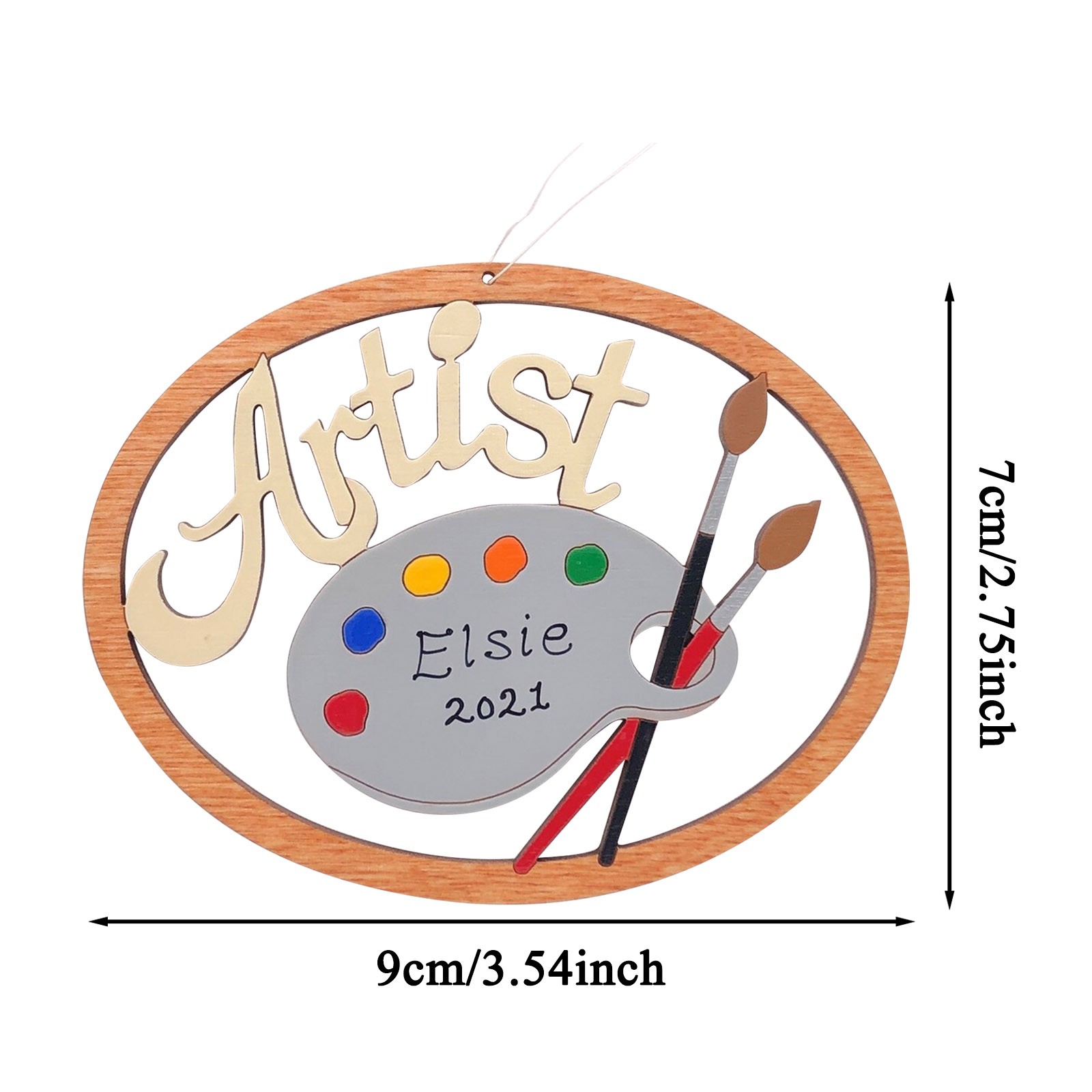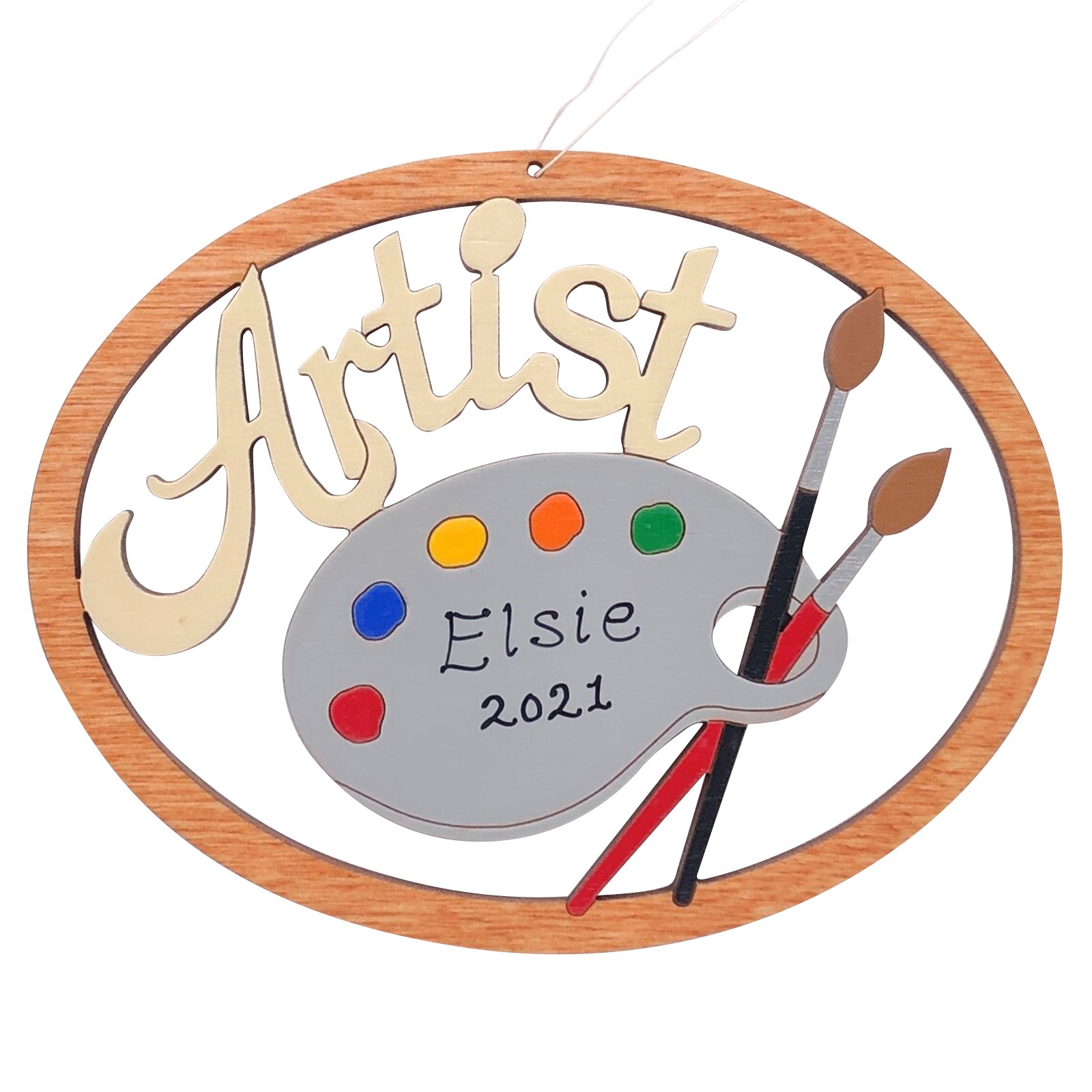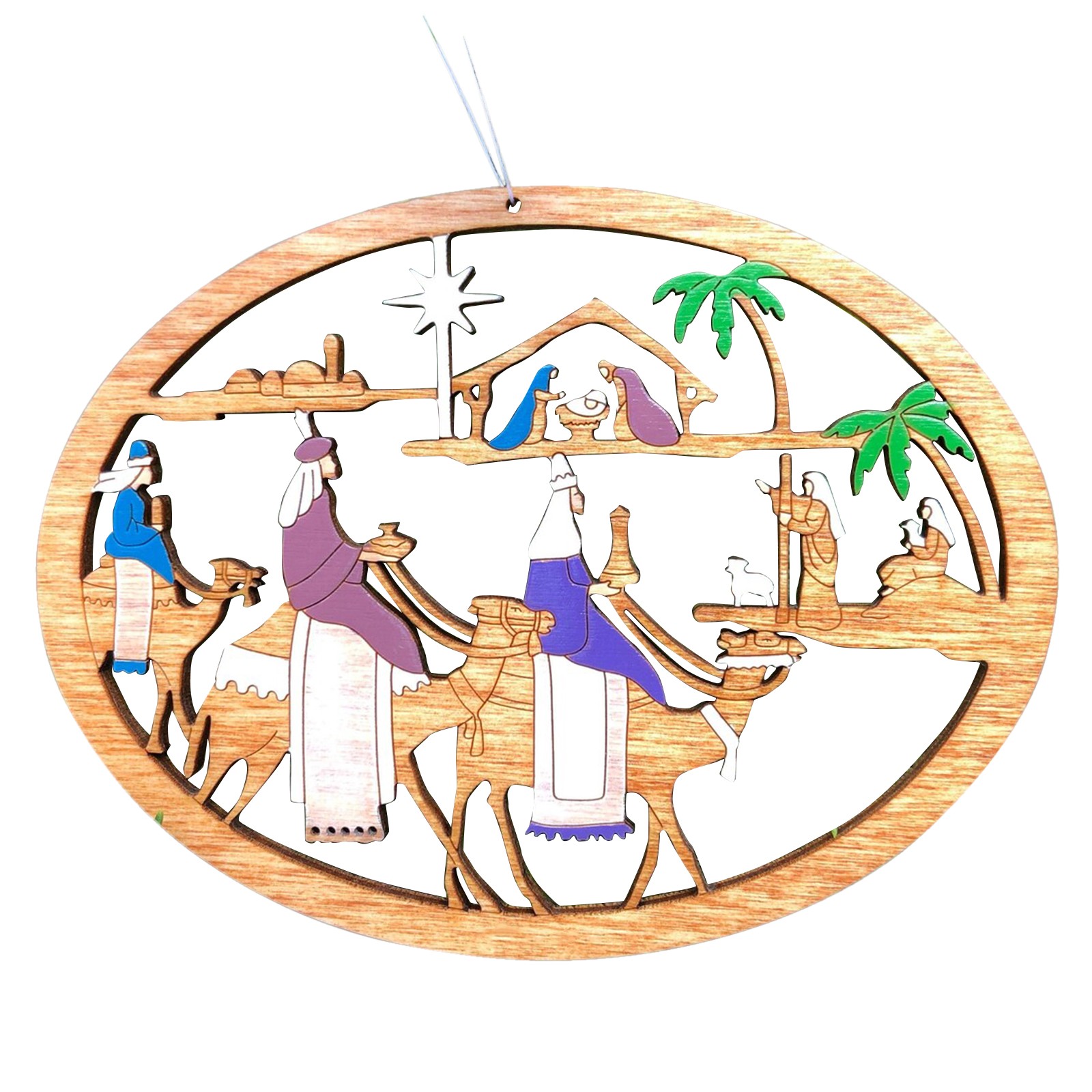 The ornament is cut with our and hand-painted. It is approximately 3.5" x 2.7". We finish our ornaments with a lacquer varnish. Ornament comes with a string attached for hanging.