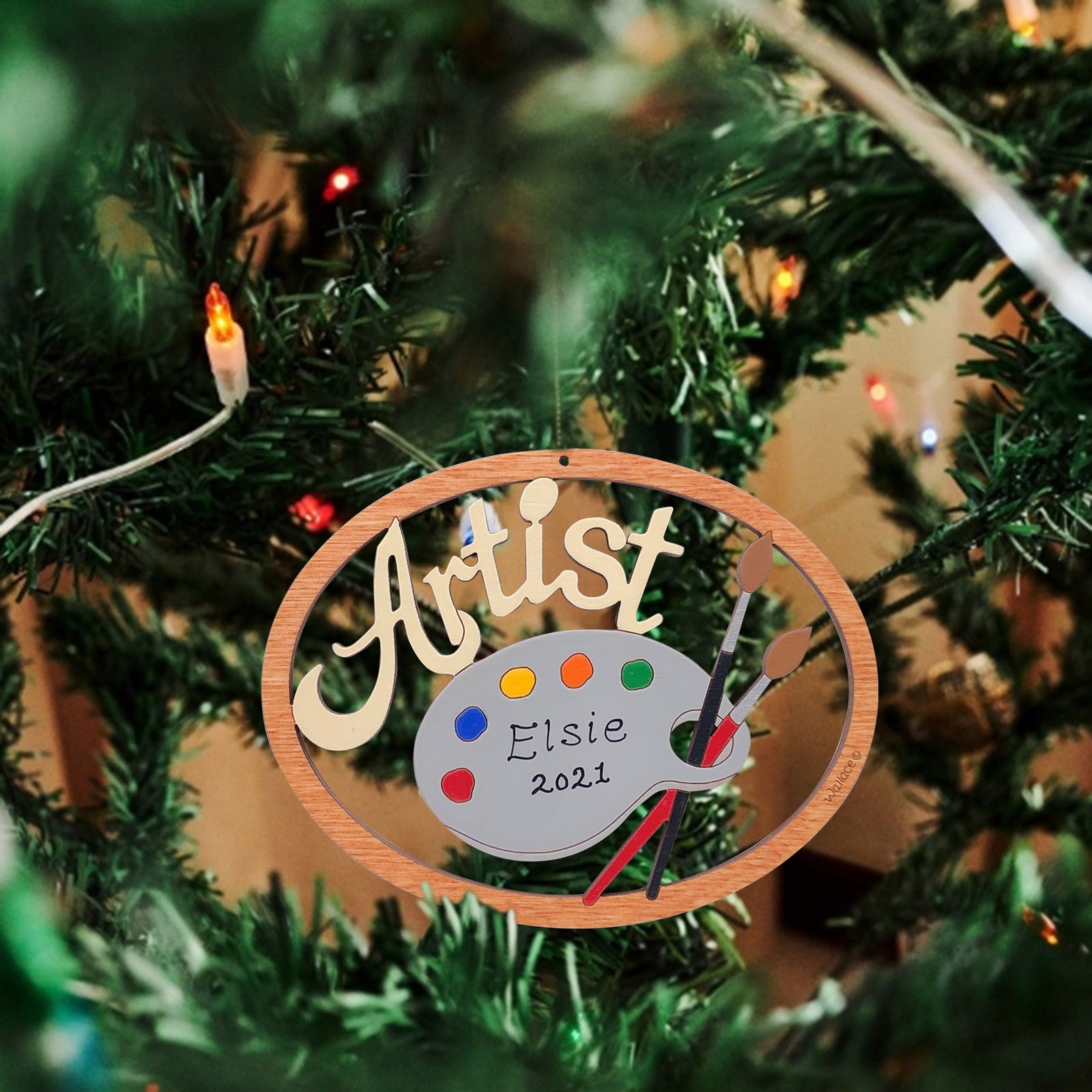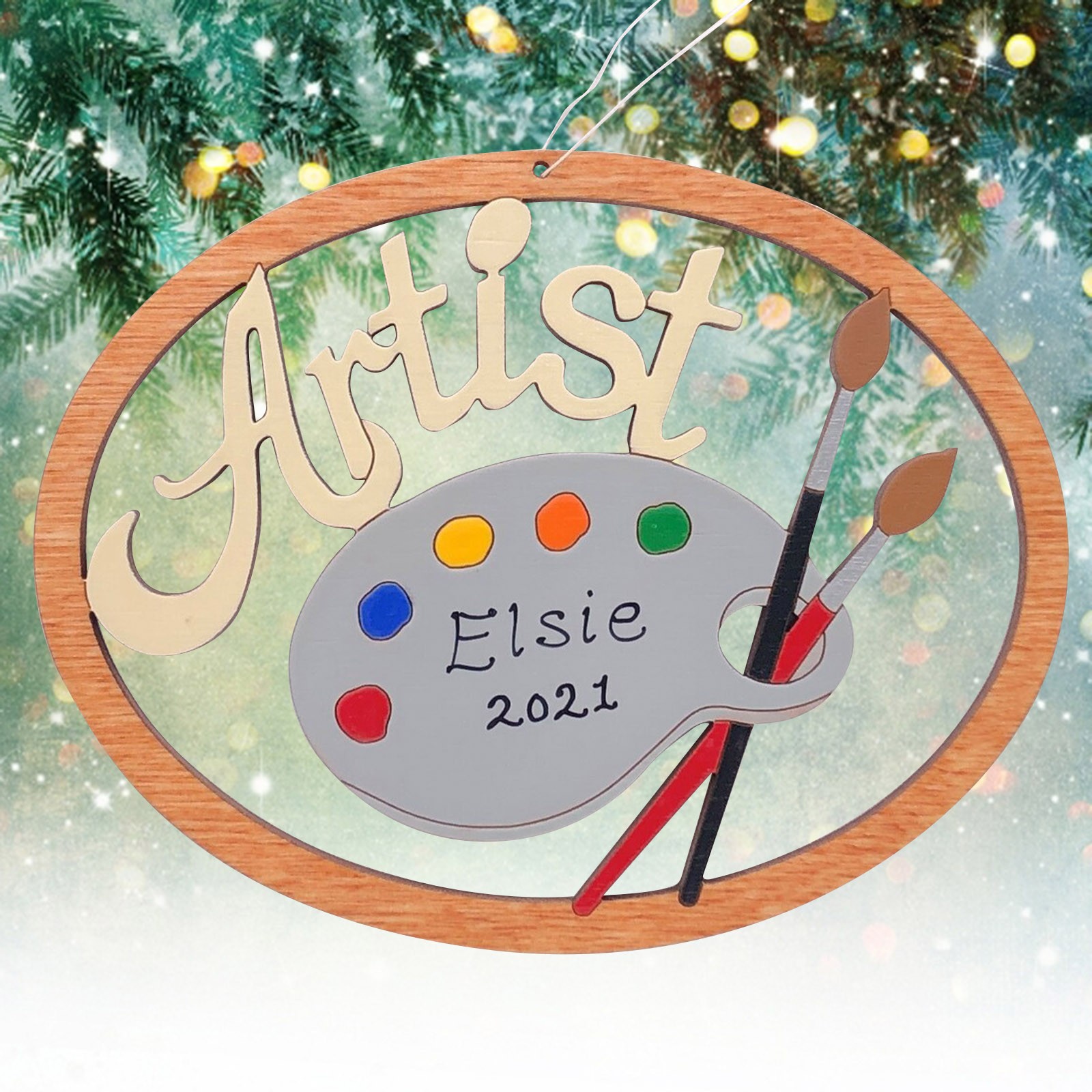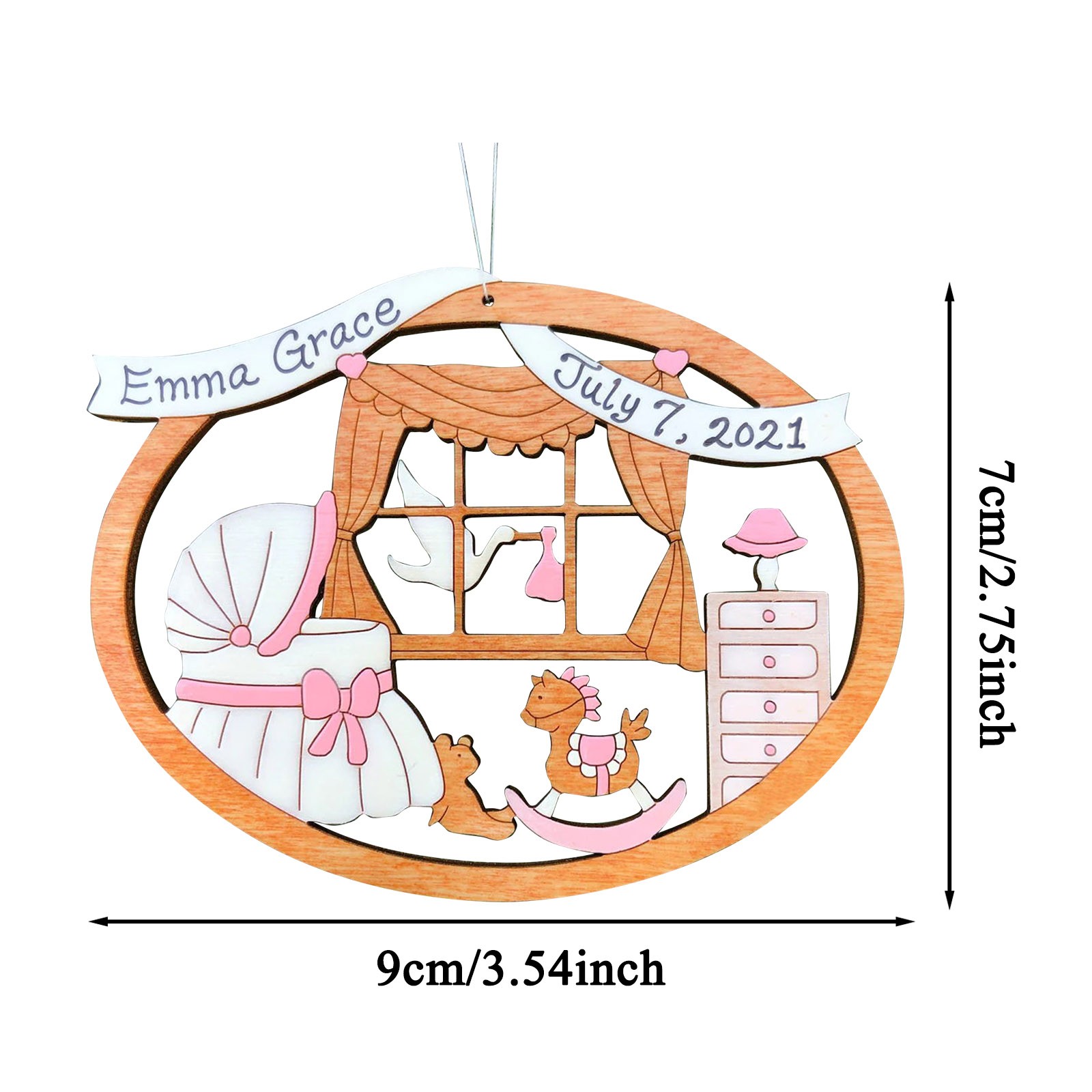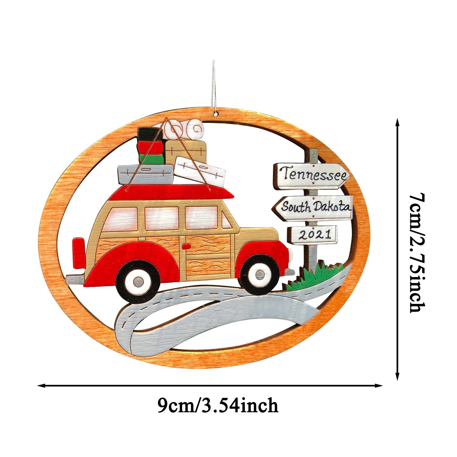 The ornament is cut with our and hand-painted. It is approximately 3.5" x 2.7". We finish our ornaments with a lacquer varnish. Ornament comes with a string attached for hanging.