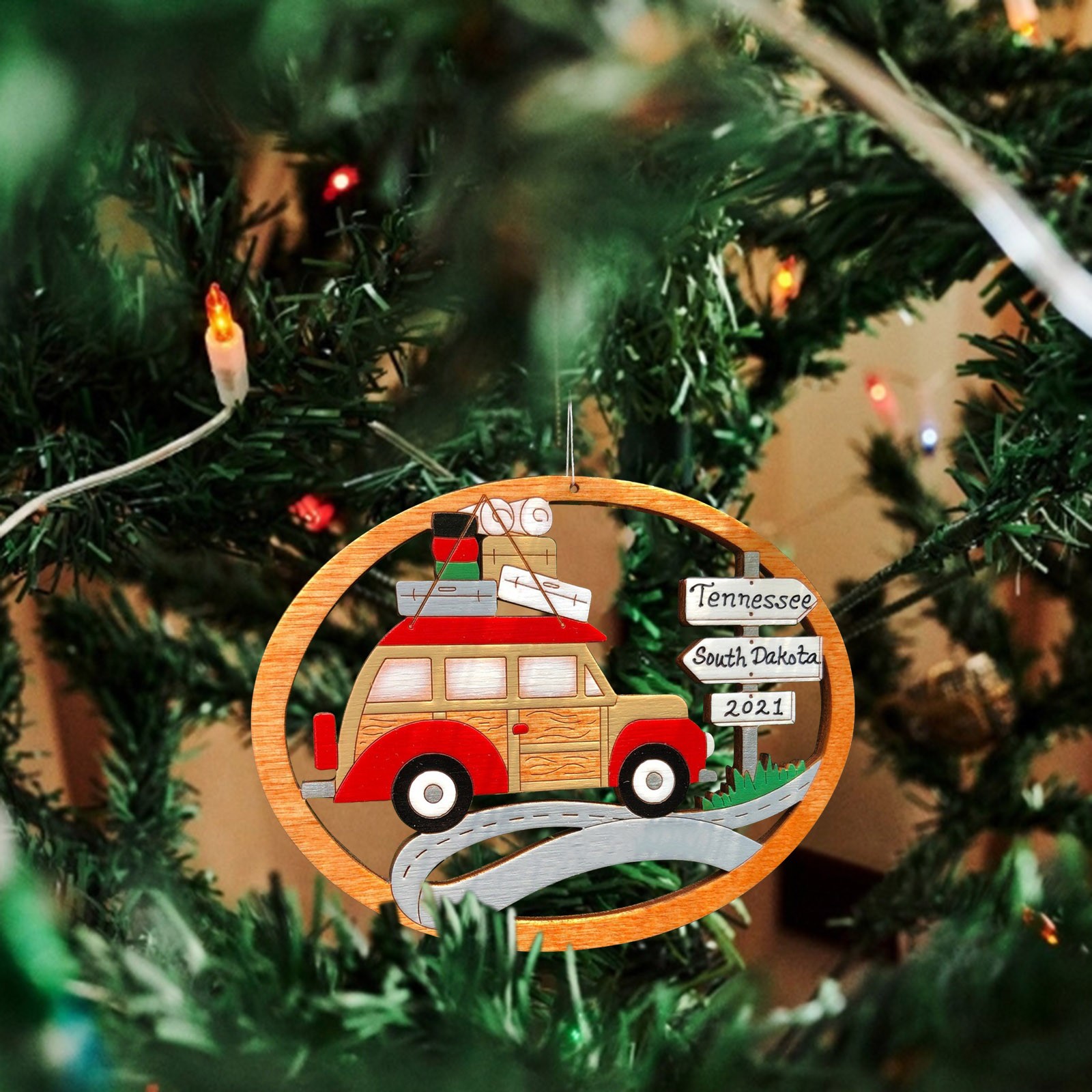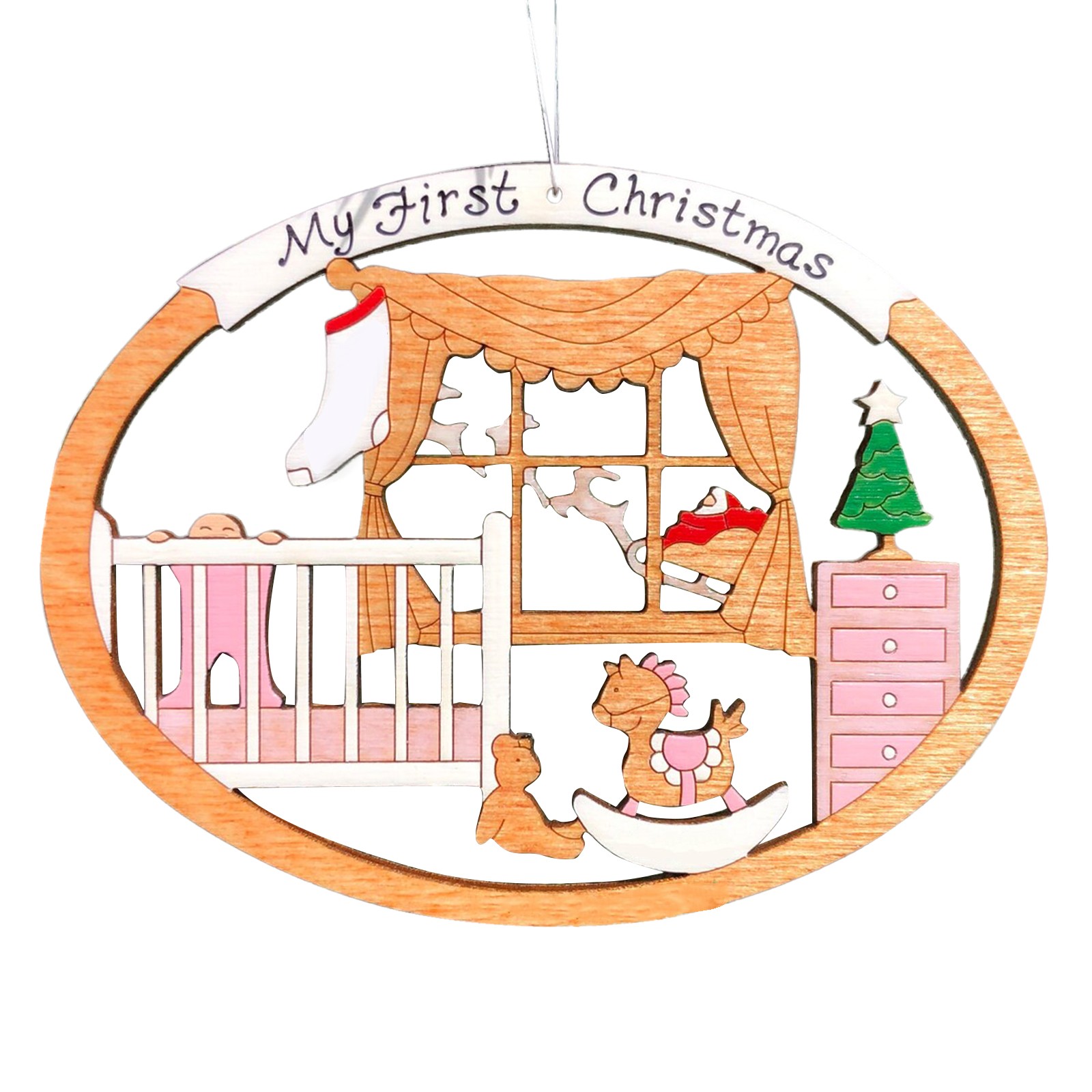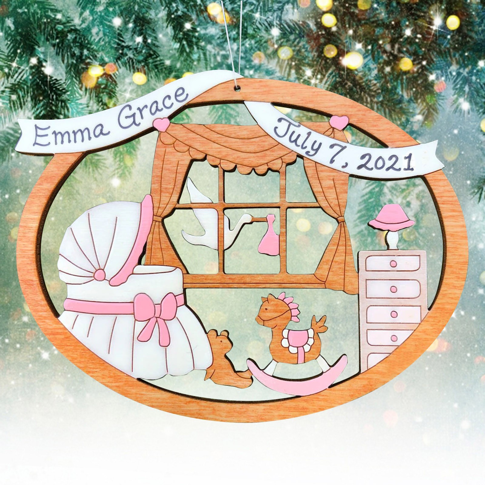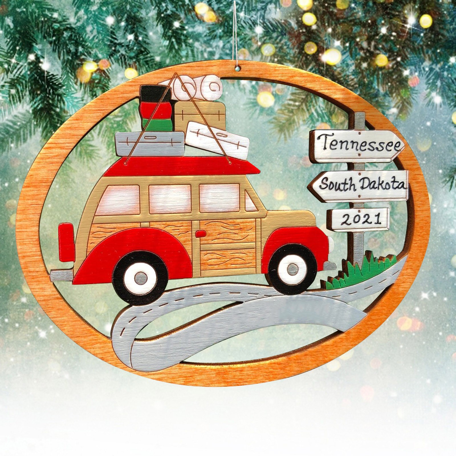 The ornament is cut with our and hand-painted. It is approximately 3.5" x 2.7". We finish our ornaments with a lacquer varnish. Ornament comes with a string attached for hanging.