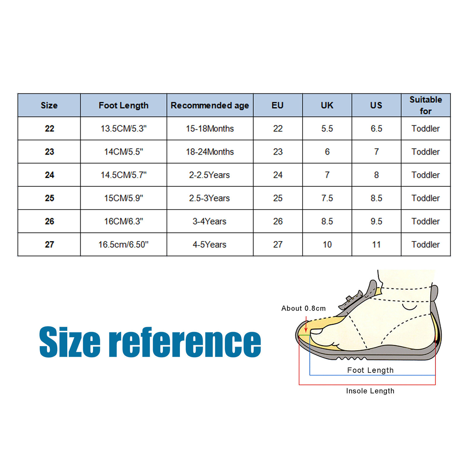Размеры Длина стопы Рекомендуемый возраст ЕС Великобритания США Подходит для 22 13,5 см/5,3" 15-18Months 22 5,5 6,5 Для малышей 23 14 см/5,5" 18-24Months 23 6 7 Для малышей 24 14,5 см/5,7" 2-2.5Years 24 7 8 Для малышей 25 15 см/5,9" 2,5, для возраста до 3 лет 25 7,5 8,5 Для малышей 26 16 см/6,3" 3-4Years 26 8,5 9,5 Для малышей 27 16,5 см/6,50'' 4-5Years 27 10 11 Для малышейБеру уже несколько раз с АлиЭкспресса ,через этот сайт. Очень довольна доставкой. Качество как всегда не подводило. Заказ приходит быстро... Читать отзыв полностью...