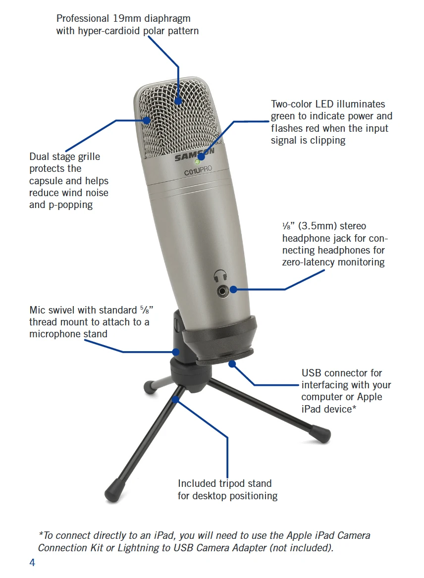 Захвата аудио в 16-бит 44,1/48 кГц разрешение с гладким без каблука амплитудно-Частотная характеристика: 20 Гц-20 кГц, c01U Pro обеспечивает аутентичную проекцию высоких и низких частот для вашего любимого приложения DAW или записи. Кроме того, Samson сохраняет свою давнюю приверженность удобству пользователя с подключением и воспроизведением (без необходимости установки драйвера), usb-питанием через Mac, ПК или iPad (кабель входит в комплект), А также включая штатив-Трипод и поворотное крепление для оптимального размещения рабочего стола. CO1U Pro совместим даже с ipad и iphone (4S и более поздними версиями) с помощью адаптера USB Lightning для Камеры Apple или комплекта подключения камеры (30-pin) для тех, кто стремится достичь уровня звука на ходу.