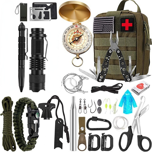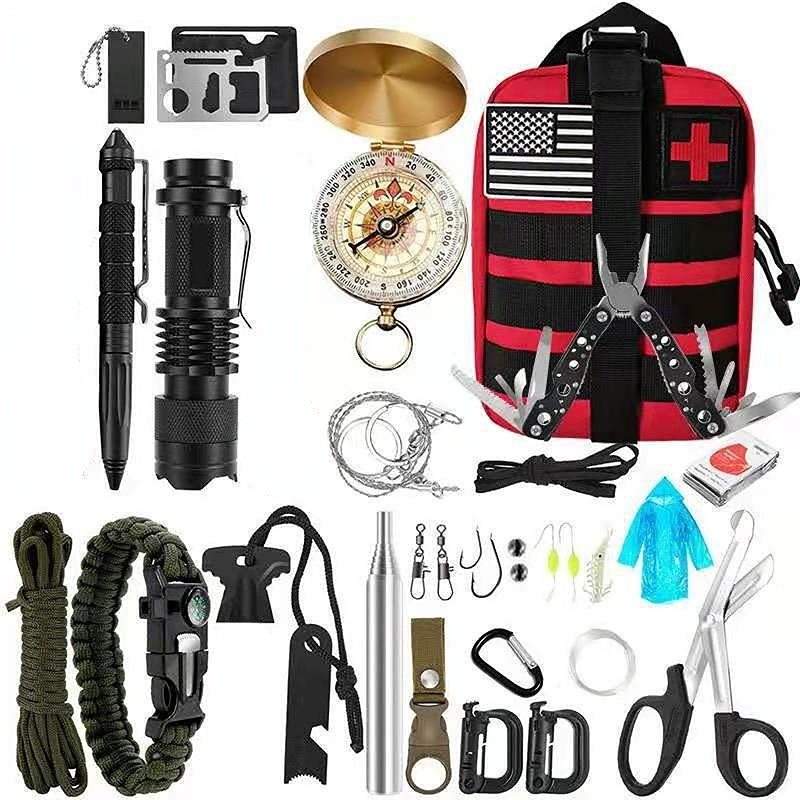 Тактический фонарик, тактическая ручка, браслет, компас, свисток, тактический нож, набор рыболовного оборудования и т. д., изготовлены из высококачественного материала, обеспечивая отличную безопасность и долговечность, удовлетворение чрезвычайных и медицинских потребностей, делает ваш кемпинг, пустыню выживания или походов проще и удобнее, не беспокоясь о потере