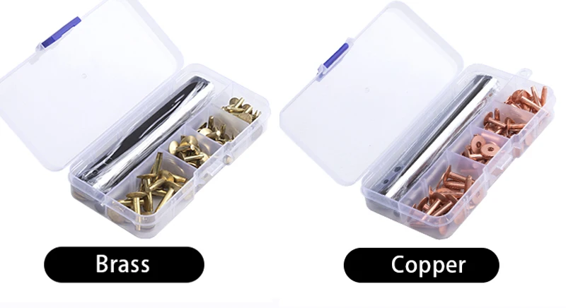 3. Набор медных заклепок, доступных в различных заклепках (диаметр крышки * длина хвостовика) --- 10x14 мм, 10x19 мм, 12x14 мм, 12x19 мм. Конечно, лучше быть слишком длинным, чем не иметь достаточной длины, чтобы пройти через ваш материал. Мы рекомендуем отрезать (прищипать) заклепку, когда вам нужно.