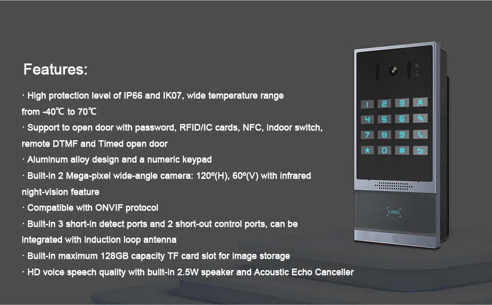 Он сочетает в себе антивандальное решение с элегантным дизайном, предлагает высокую прочность, чтобы гарантировать самое высокое покрытие на рынке в соответствии со стандартами IP66 и IK07. Он сочетает в себе безопасность, видео домофон и функцию вещания, предлагает лучшее решение для общения для пользователей.