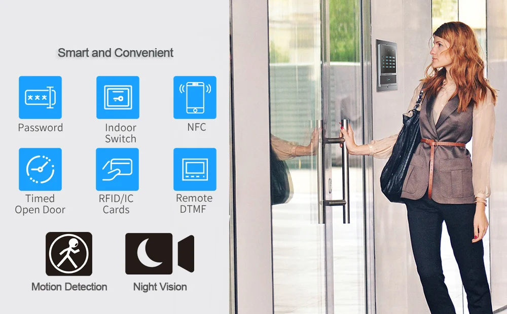 Q64i обеспечивает умное управление доступом с помощью паролей, RFID/IC карт, NFC, переключатель для внутренней установки, удаленного DTMF и таймизированной открытой двери.