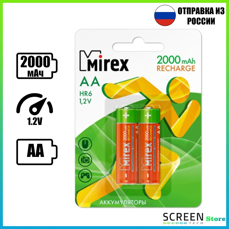 Ni-MH аккумуляторная батарея AA 2000 мАч 1,2В Mirex пальчиковый аккумулятор высокой емкости AA/HR6 для электроники, упаковка 2 шт.
