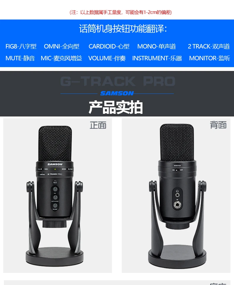 Особенности: 1. Универсальный Профессиональный usb-микрофон с аудио интерфейсом2. Идеально подходит для подкачки, игр/потоковой передачи и записи музыки3. Две 1 " (25 мм) конденсаторные капсулы4. Кардиоидный (однонаправленный), двунаправленный и всенаправленный пикап5. Гладкая, плоская частотная характеристика 50 Гц-20 кГц6. 24-битный, 96 кГц разрешение7. Выход USB для подключения к любому устройству Mac или ПК8. 1/4 "Вход инструмента для подключения гитар или устройств линейного уровня9. Запись микрофона и ввода инструмента одновременно10. 1/8 "стерео выход для наушников с контролем уровня для мониторинга нулевой задержки11. На каждый день, 3 цвета Мощность/зажим/немой светодиодный12. Plug-and-play, установка драйвера не требуется13. Совместим с большинством компьютерных цифровых аудио рабочих станций программного обеспечения14. Конструкция из литого цинка с решеткой из толстой сетки15. Интегрированное настольное основание Характеристики:Полярный узор: кардиоидный (однонаправленный), двунаправленный, всенаправленныйКапсула: двойной конденсаторШирина диафрагмы/Толщина: 25 мм/3 мкмЧастотная характеристика: 50 Гц-20 кГцЧувствительность: + 6 дБ FS/PA (все полярные узоры)Макс. SPL: 120 дБ SPLГлубина бит: 16 или 24 битЧастота образцов: до 96 кГцЦифровой выход: USBНаушников Выход: 1/8 "(3,5 мм)Сопротивление наушников: 16 ΩВыходная мощность наушников: 85 МВт @ 32 ОмВход инструмента: 1/4"Входное сопротивление инструмента: 1MΩЭлементы управления: бесшумный, микрофон/инструмент/громкость наушников, монитор вкл/выкл, Mono/2 трекаРазмеры изделия: 4,5 " (116 мм) x 10,5" (268,5 мм) ДиаметрПродукт Вес: 3.52lb (1,6 кг) Что входит в комплект:Интегрированное настольное основаниеАдаптер для микрофонаUsb-микрофон Samson G-Track ProUsb-кабель