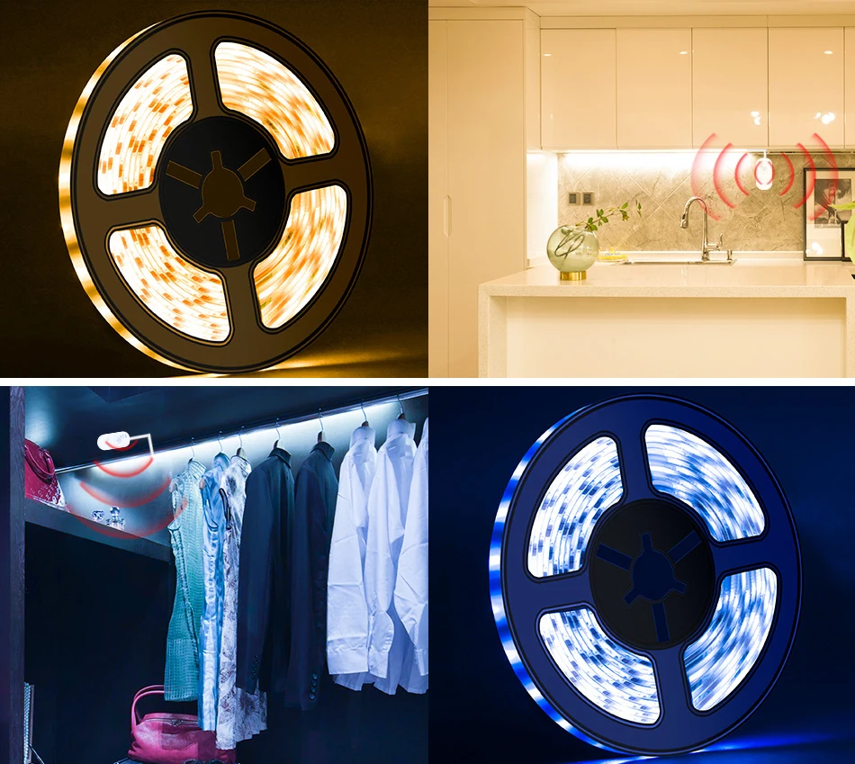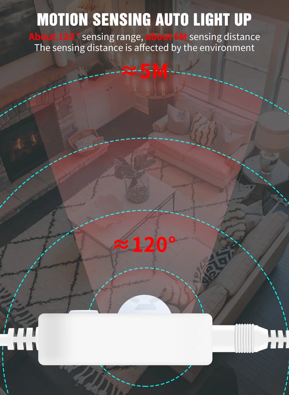 · Always Light Mode, the light strip is always on, and the sensing mode is off.With high-precision light control technology, the sensor is affected by ambient light.· "Sun" Mode, work for 24 hours whole day, not affected by light. When the product sensing human movement, it will auto light up.· "Moon" Mode, only work at dark. When the product sensing human movement, it will auto light up.Specification:*Voltage:DC 5V