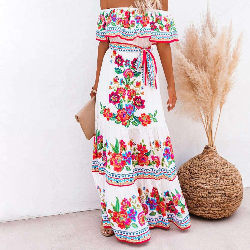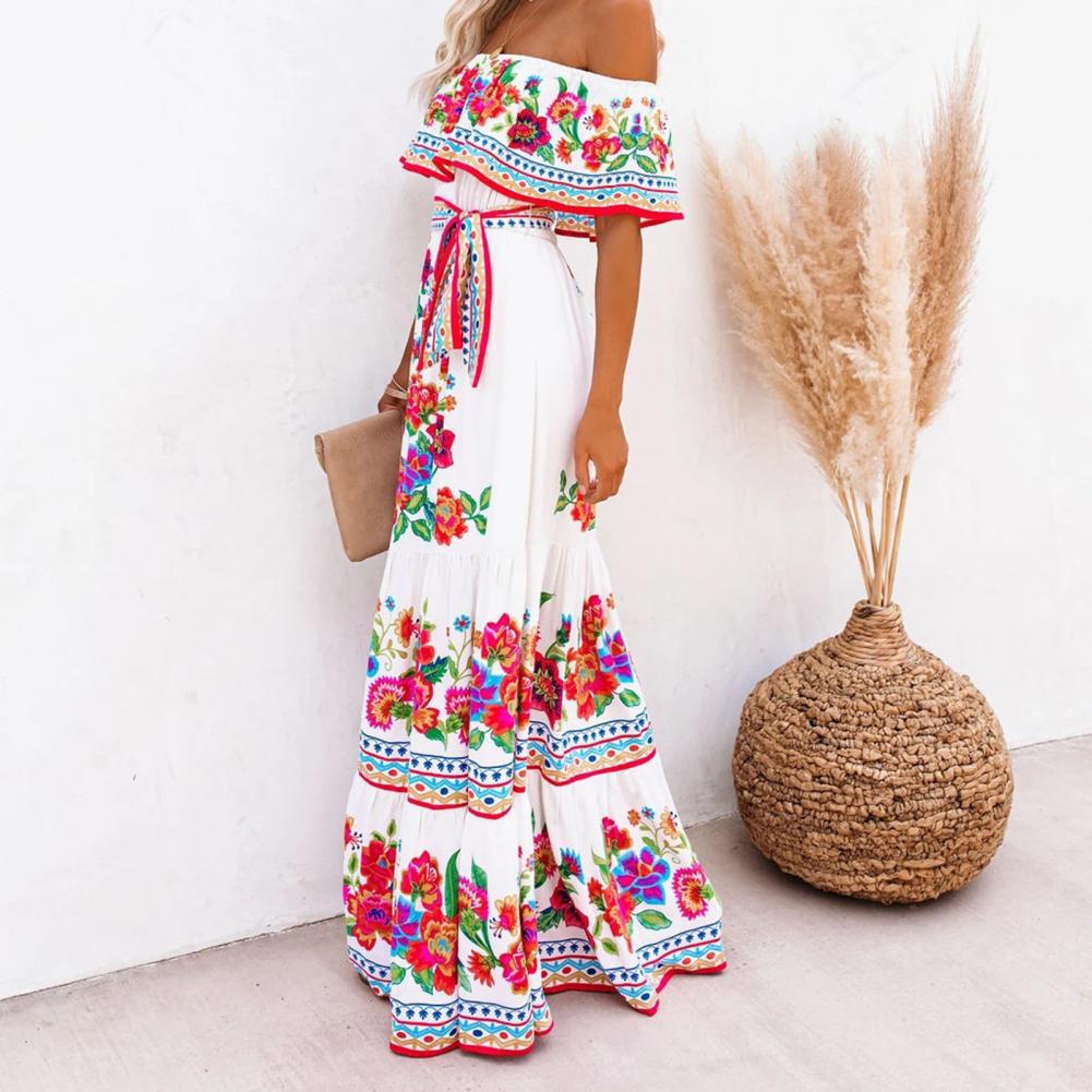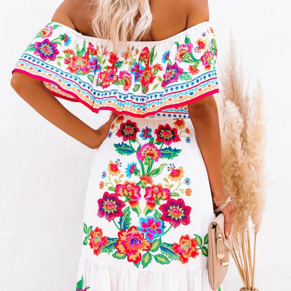 Летнее платье с цветочным принтом, с высокой талией, женские вечерние платья с горизонтальными плечами