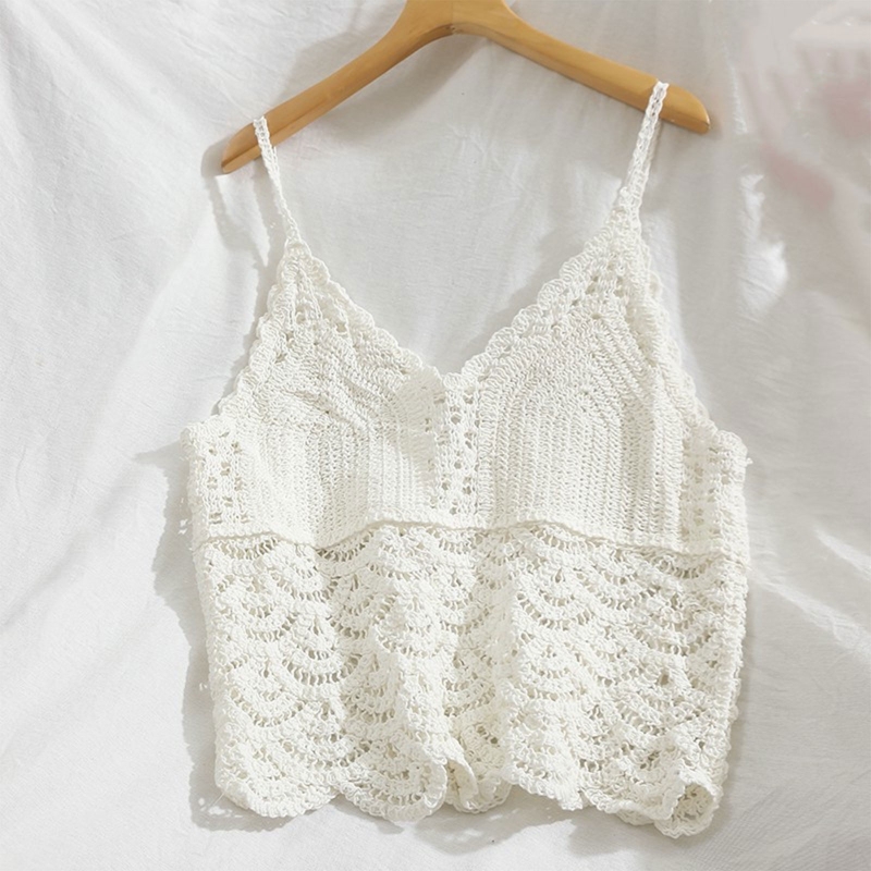 Простой однотонный цвет, ажурный вязаный крючком, волнистая отделка снизу, обрезанная длина.