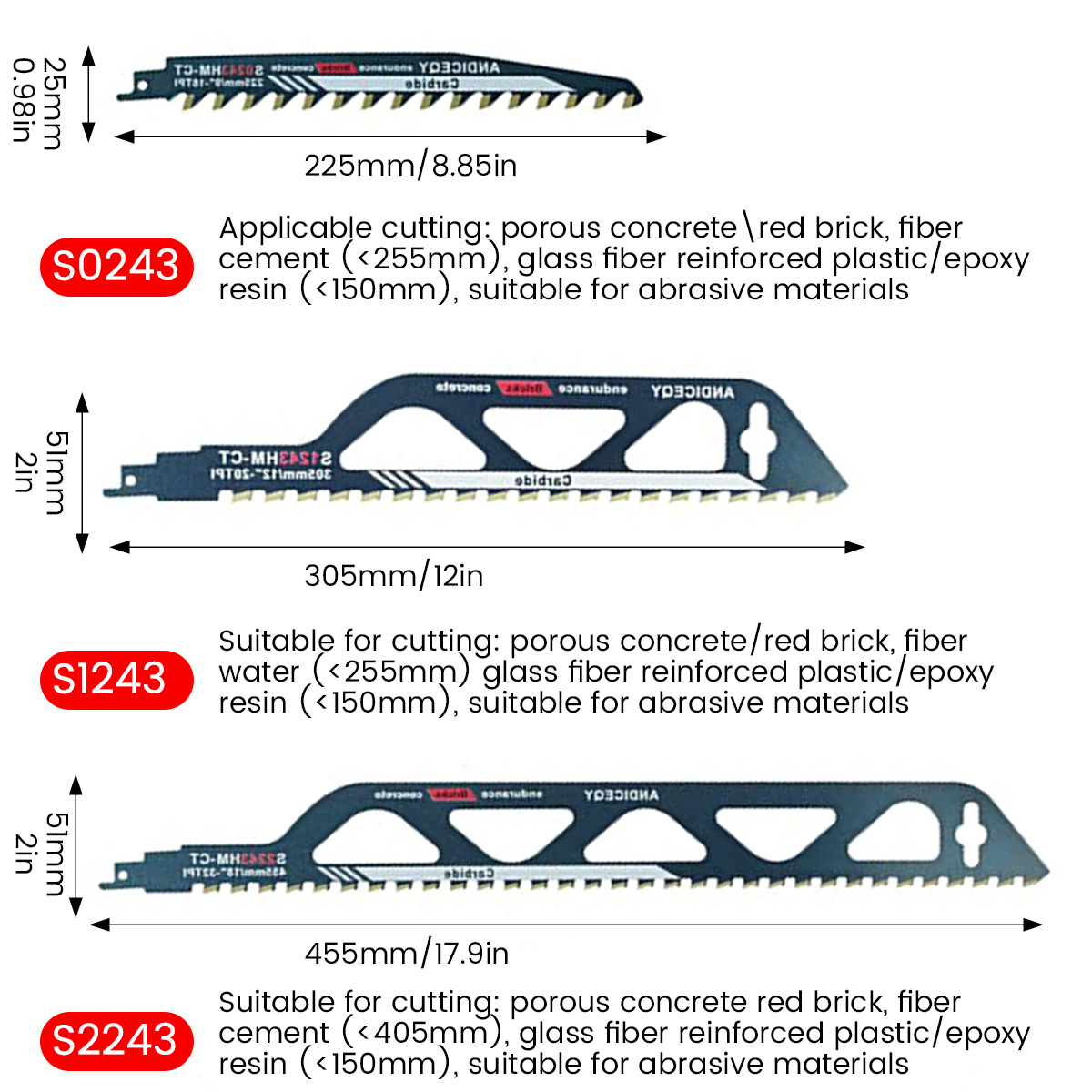 455x51x1,5 мм/17,91x2x0,06 дюйма, подходит для резки пористого бетона красного кирпича, волокнистого цемента (<405 мм), армированный стекловолокном пластик/эпоксидная смола (<150 мм), подходит для шлифовальных материалов.