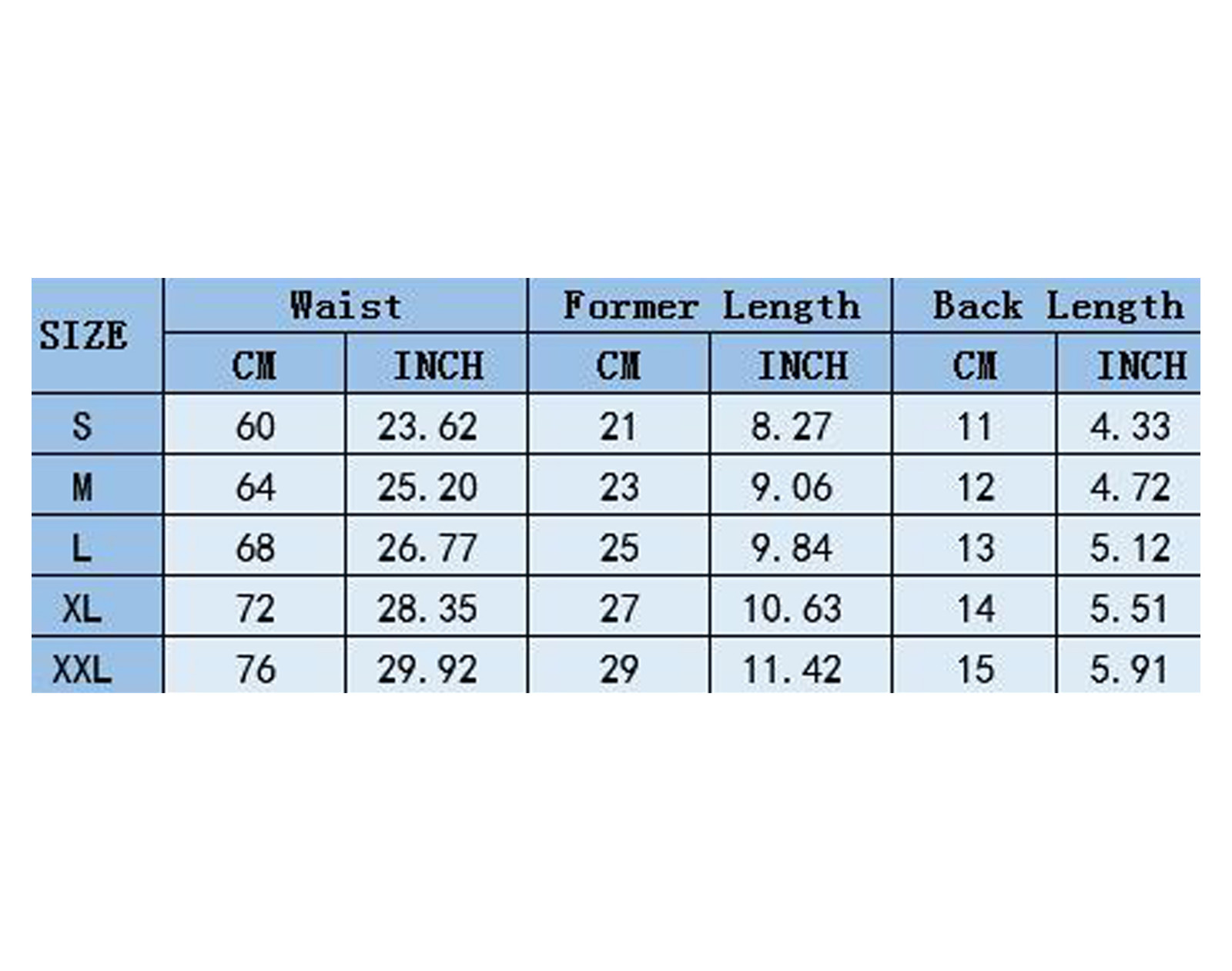 Размеры Американский размер Размер Великобритании Европейский размер Талия Прежняя длина Длина спины S 4 8 32 60 см/23,62'' 21 см/8,27'' 11 см/4,33'' М 6 10 34 64 см/25,20'' 23 см/9,06'' 12 см/4,72'' L 8 12 36 68 см/26,77'' 25 см/9,84'' 13 см/5,12'' XL 10 14 38 72 см/28,35'' 27 см/10,63'' 14 см/5,51'' XXL 12 16 40 76 см/29,92'' 29 см/11,42'' 15 см/5,91'' Размер: S Размер США: 4 Размер Великобритании: 8 Европейский размер: 32 Талия: 60 см/23,62 дюйма Прежняя длина: 21 см/8,27 дюйма Задняя Длина: 11 см/4,33'' Размер: M Размер США: 6 Размер Великобритании: 10 Европейский размер: 34 Талия: 64 см/25,20 дюйма Прежняя длина: 23 см/9,06 дюйма Задняя Длина: 12 см/4,72'' Размер: L Размер США: 8 Размер Великобритании: 12 Европейский размер: 36 Талия: 68 см/26,77 дюйма Прежняя длина: 25 см/9,84 дюйма Задняя Длина: 13 см/5,12'' Размер: XL Размер США: 10 Размер Великобритании: 14 Европейский размер: 38 Талия: 72 см/28,35 дюйма Прежняя Длина: 27 см/10,63 дюйма Длина спины: 14 см/5,51 дюйма Размер: XXL Размер США: 12 Размер Великобритании: 16 Европейский размер: 40 Талия: 76 см/29,92 дюйма Прежняя Длина: 29 см/11,42 дюйма Задняя Длина: 15 см/5,91''