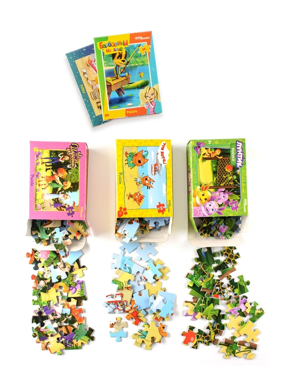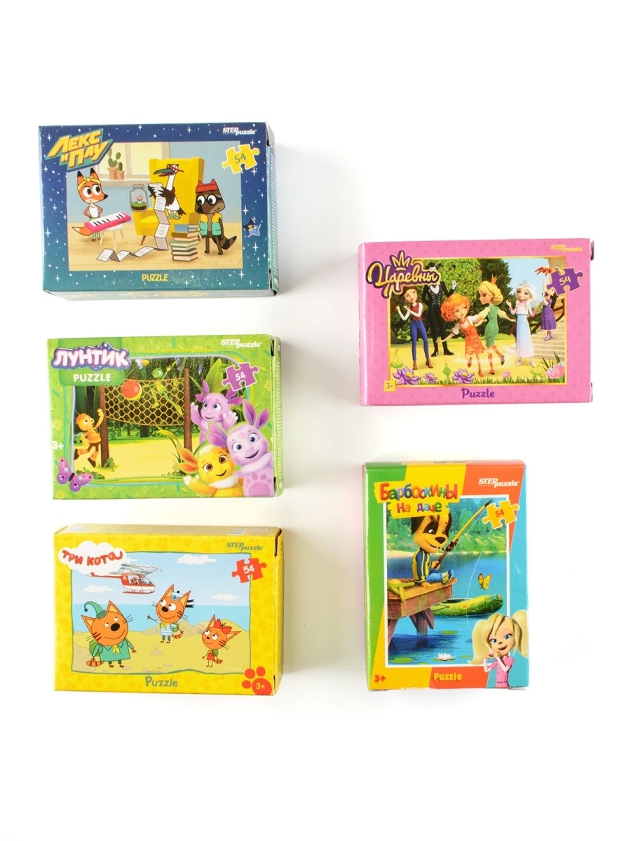 Название бренда Step Puzzle Рекомендованный возраст; Ширина От 4 до 6 лет Происхождение Россия Тип мозаики Стандартный Материал Другое Пол Унисекс Колличество элементов 54 Тематика изображения Мультфильмы, Детское Комплектация Пазлы - 5 шт по 54 элементавнешний вид товара