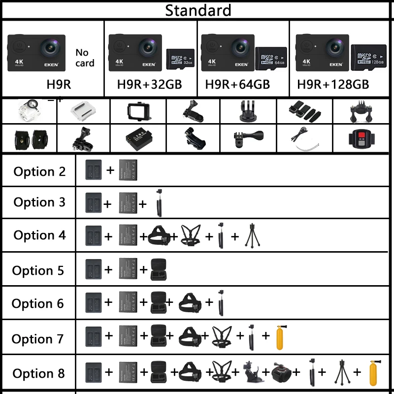 Вариант 8: Стандарт + двойное зарядное устройство + аккумулятор + Коллекционная сумка + ремень на голову + нагрудный ремень + держатель для автомобиля + ремешок на запястье + монопод + штатив + плавающая палка