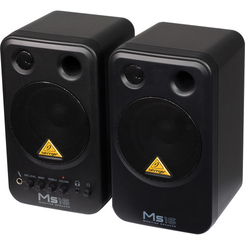 Behringer MS16 - активная мониторная стереосистема начального уровня для небольших студий. Каждый двухполосный динамик, оснащенный 4-дюймовым низкочастотным драйвером и 1,5-дюймовым твитером, питается от усилителя мощностью 8 Вт. Система предназначена для использования в домашних студиях. На передней панели правого динамика MS16 расположены вход для микрофона и выход на наушники, регуляторы низких и высоких частот. На задней панели устройства имеются два независимых линейных входа RCA, которые позволяют одновременно контролировать различные аудиоисточники. Динамики соединены между собой кабелем RCA и промаркированы как левый и правый.