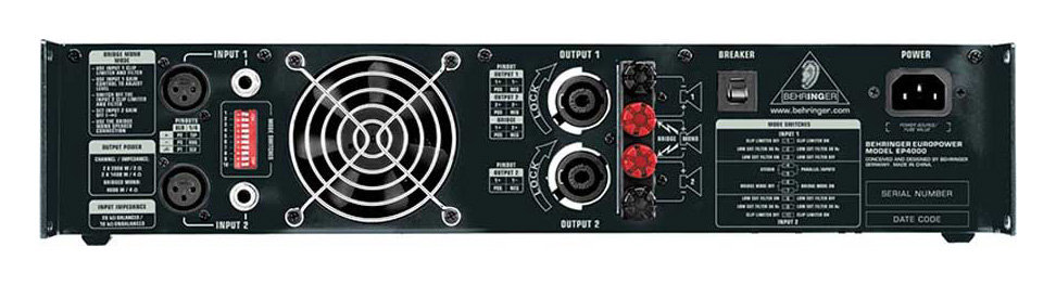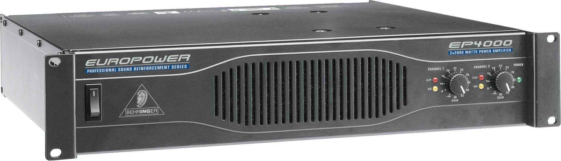 Behringer EP4000 – профессиональный студийный двухканальный усилитель мощности класса H. Работает в монофоническом, стереофоническом и мостовом режимах. Рассчитан на подключение концертных АС, требующих высоких мощностей. Выходная мощность сигнала, обработанного с помощью усилителя, зависит от сопротивления и количества подключенных к нему динамиков. В случае стереофонического подключения АС сопротивлением 2 Ом номинальная мощность сигнала в каждом канале составит 1250 Вт. При нагрузке с сопротивлением 4 Ом мощность сигнала на канал составляет 950 Вт, восьмиомная нагрузка соответствует 550 Ваттам на канал. В режиме моста, когда сигнал подаётся на одну АС с сопротивлением 4 Ом, мощность равна 2400 Вт. С восьмиомной нагрузкой в мостовом режиме усилитель выдает 1750 Вт. Технология Accelerated Transient Response улучшает воспроизведение низких частот, транслируемых через требовательные к интенсивности сигнала НЧ-динамики, выравнивая их. Уровень искажений при обработке сигнала устройством не превышает 0,01%. Каждый из двух каналов усилителя имеет собственный лимитер, регулятор усиления и индикаторы сигнала и клиппирования. Имеется отключаемый низкочастотный фильтр, отсекающий технические шумы, создаваемые электронным оборудованием. Для подключения использованы балансные разъемы XLR и 1/4" TRS Jack. Выходные разъёмы SPEAKON с блокировкой коннекторов, предупреждающих выдёргивание кабелей продублированы зажимами под оголённые провода. Внутри находятся силовые транзисторы Toshiba/Fairchild и тороидальный трансформатор для большей надежности. Встроены предохранители от короткого замыкания, открытой цепи, перегрева и высокой частоты, глушители сигнала для защиты динамиков при включении и выключении усилителя, а также автоматическое реле для отключения усилителя при прекращении подачи тока. Усилитель выполнен в рэковом формате высотой 2U, а благодаря резиновым ножкам он может использоваться и как отдельно стоящий.