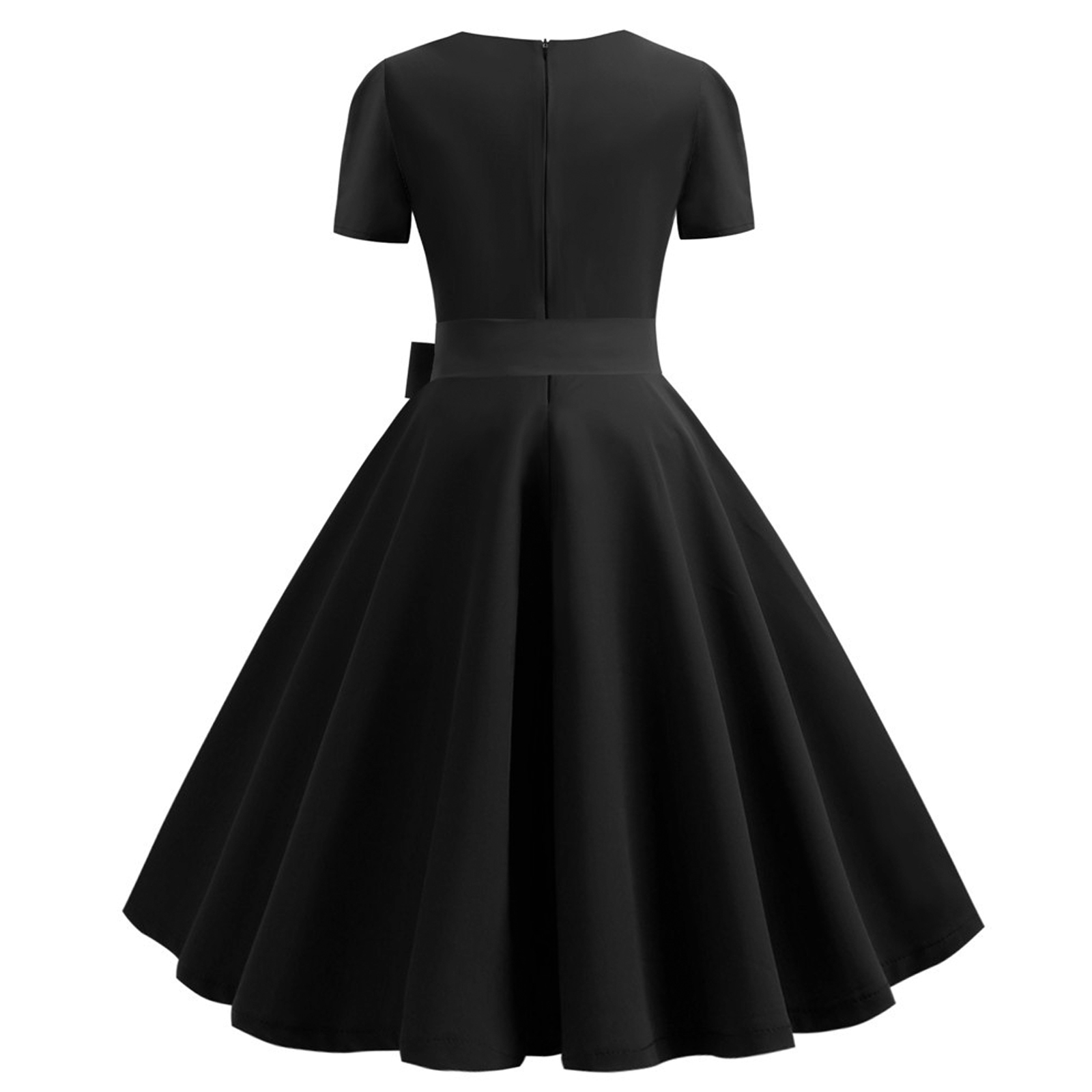 Короткий рукав, квадратный вырез, украшение на пуговицах, высокая талия, пояс для завязывания банта, застежка-молния сзади.