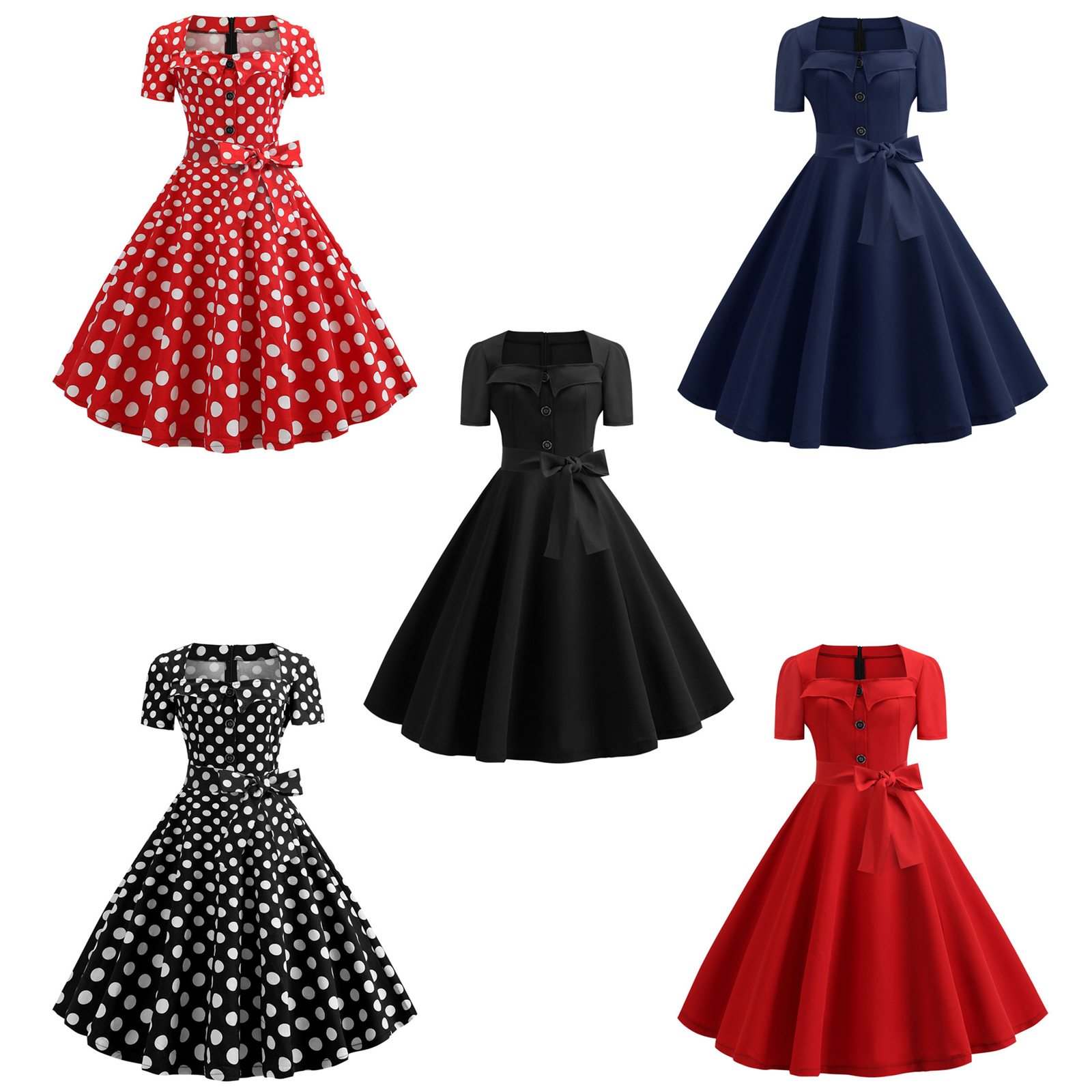 Винтажное платье-качели, однотонное или с узором в горошек на выбор, создает очаровательный стиль в стиле ретро.