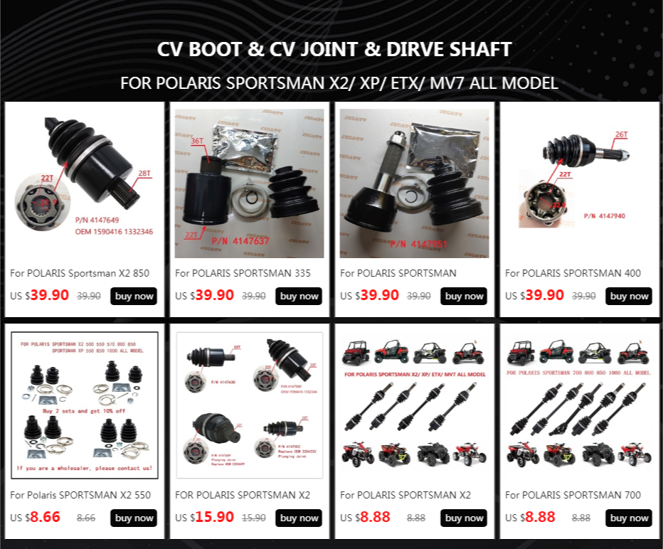 1). Купите 2 комплекта и получите скидку 10% 2) Если вы оптовый продавец, пожалуйста, свяжитесь с нами по оптовым ценам 3) Если вам нужен приводной вал CV оси, пожалуйста, сообщите нам номер товара, который вам нужен. 2. Описание продукта Материал Ботинок изготовлен из резины OEM класса DCR66, которая разработана специально для требований современных ATV и UTV: В комплект входят два зажима из нержавеющей стали, которые предназначены для затягивания без использования специальных инструментов. Молибденовая смазка на основе лития обеспечивает хорошую смазку для длительного срока службы соединения CV. 3 Применение модели